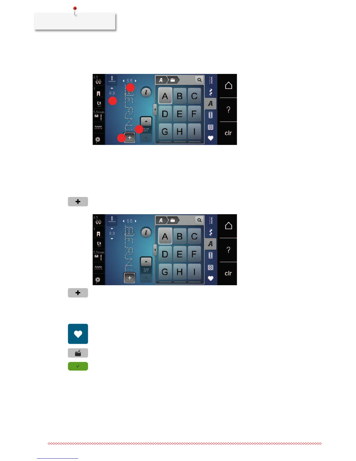 > Touch the icon «Confirm» or the yellow-framed icon to save the stitch pattern combination.