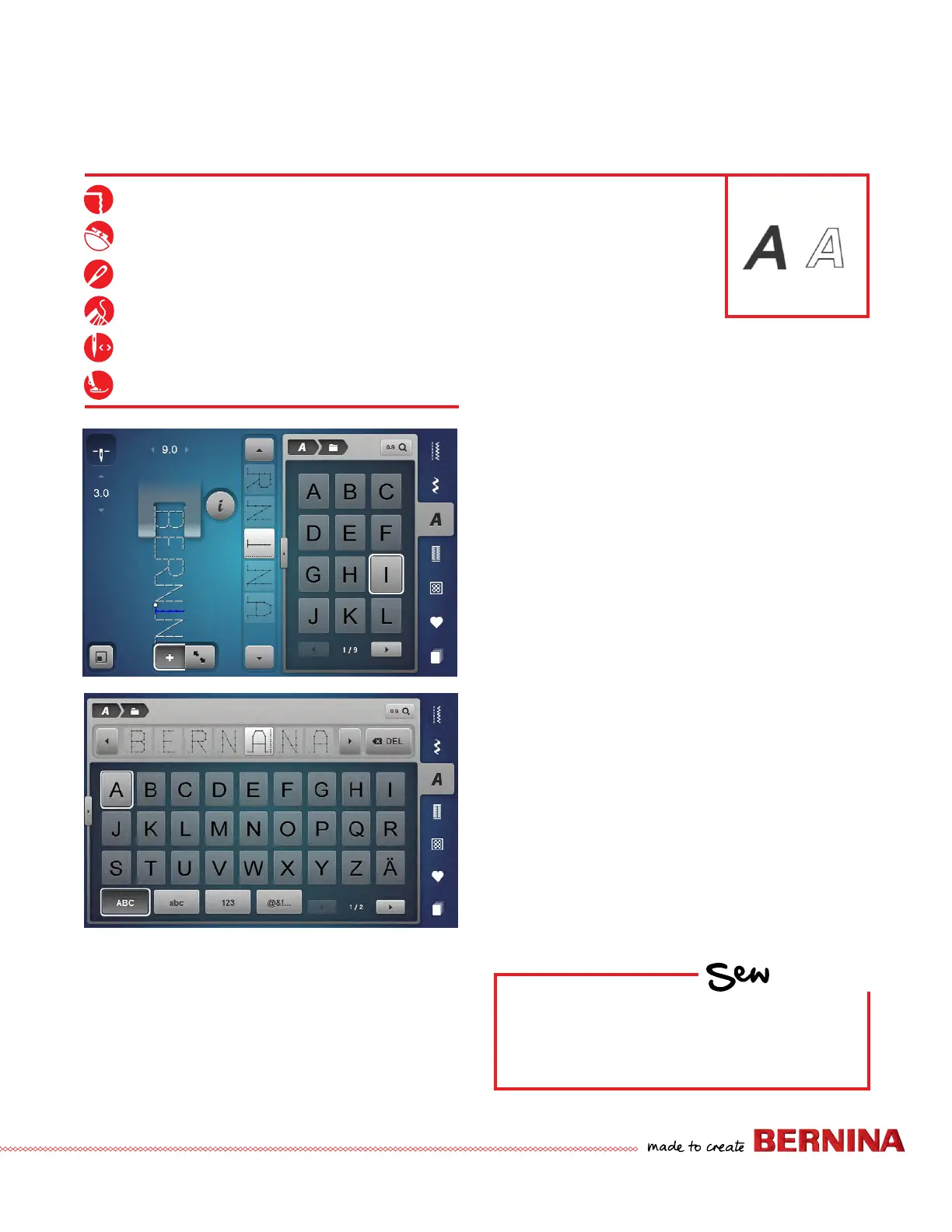 Bernina 480 - COMBI MODE-LETTERING; Using the Transition window to enter and edit text