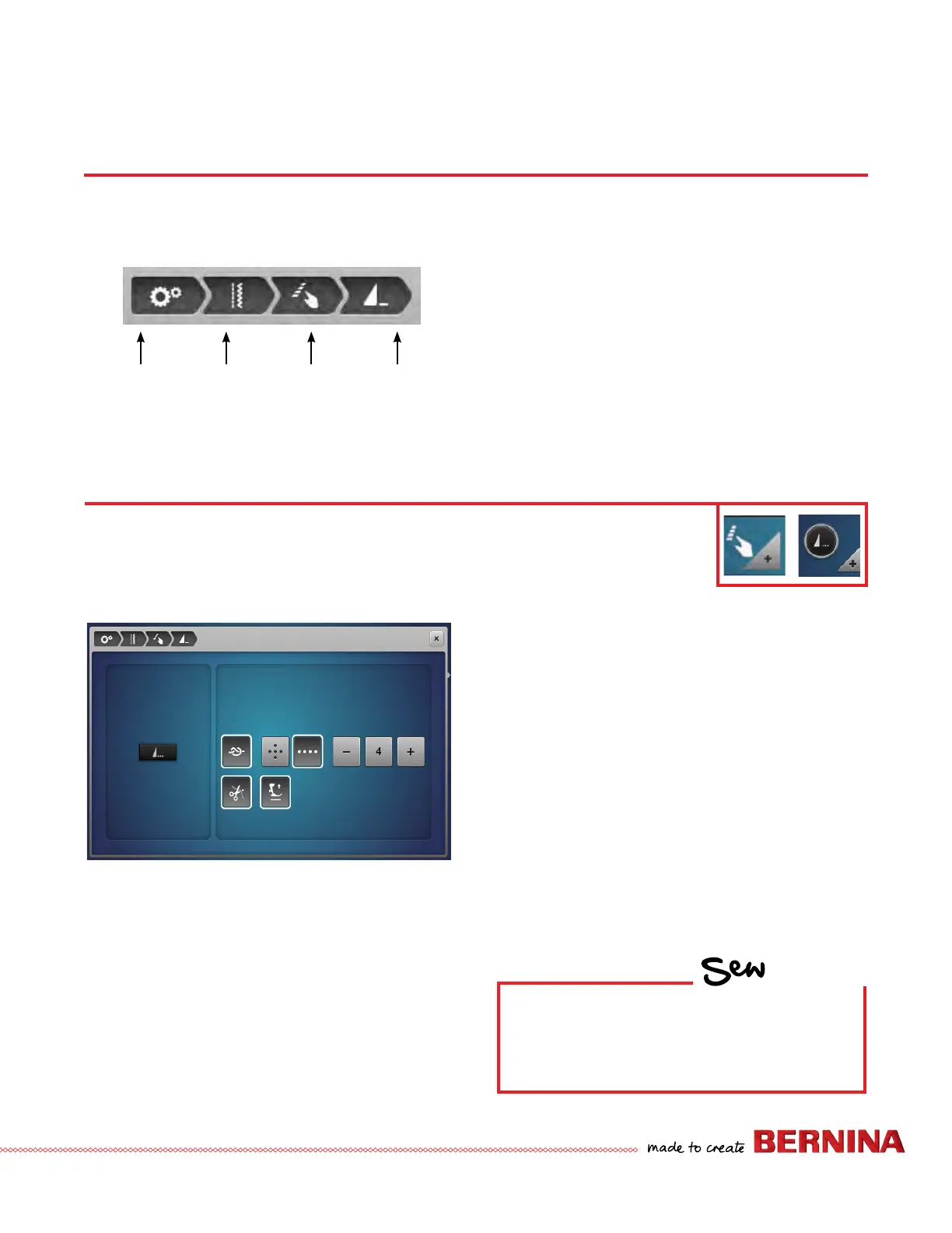 feature when setting preferences within several menus in Setup, Embroidery Motif Selection, and the "i" menu in sewing and