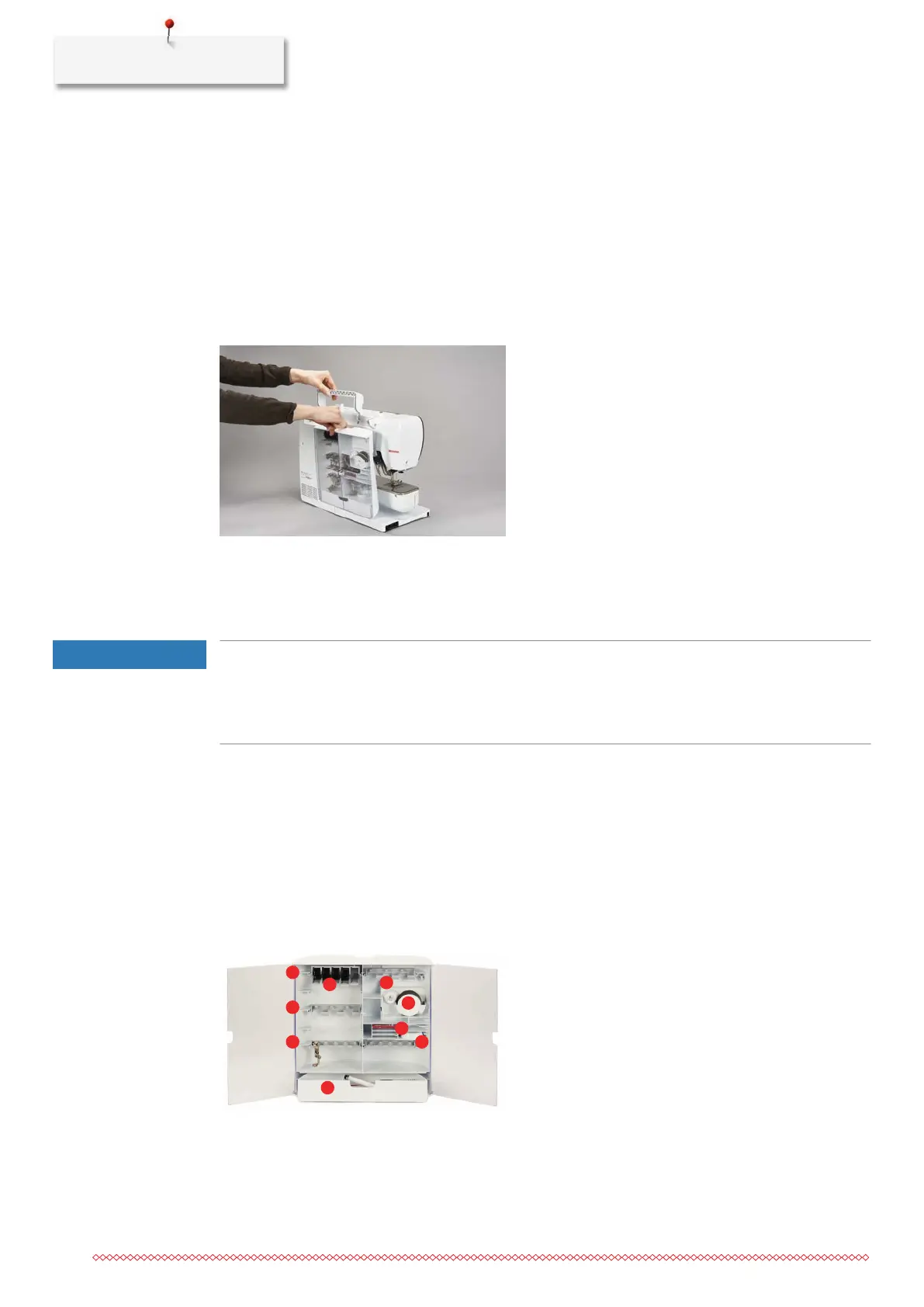 The accessory box is fixed to the machine by means of four magnets. When attaching, the drawer has to be