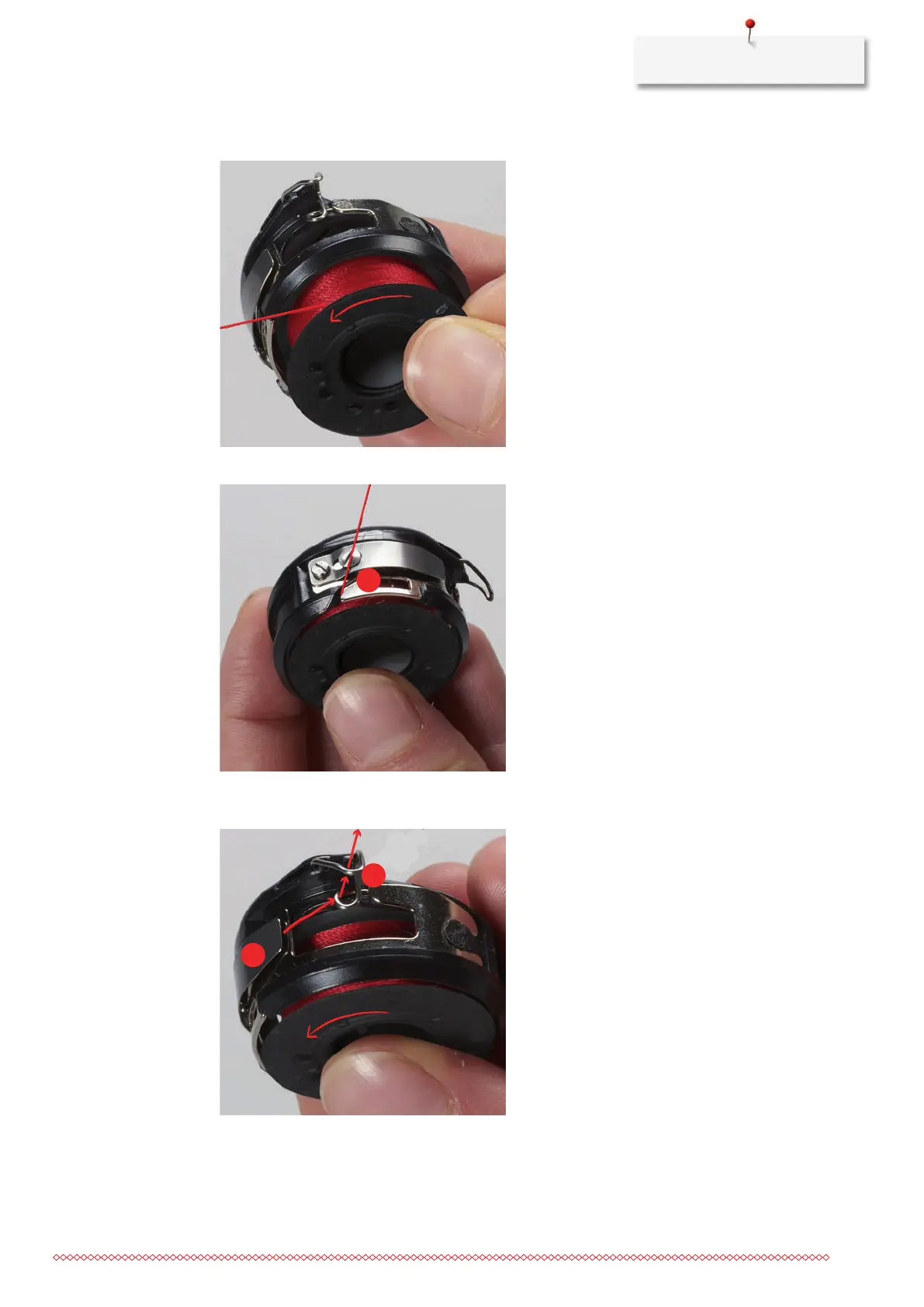 > Pull the thread to the right under the spring (3), then lead the thread under the two thread guides (4)