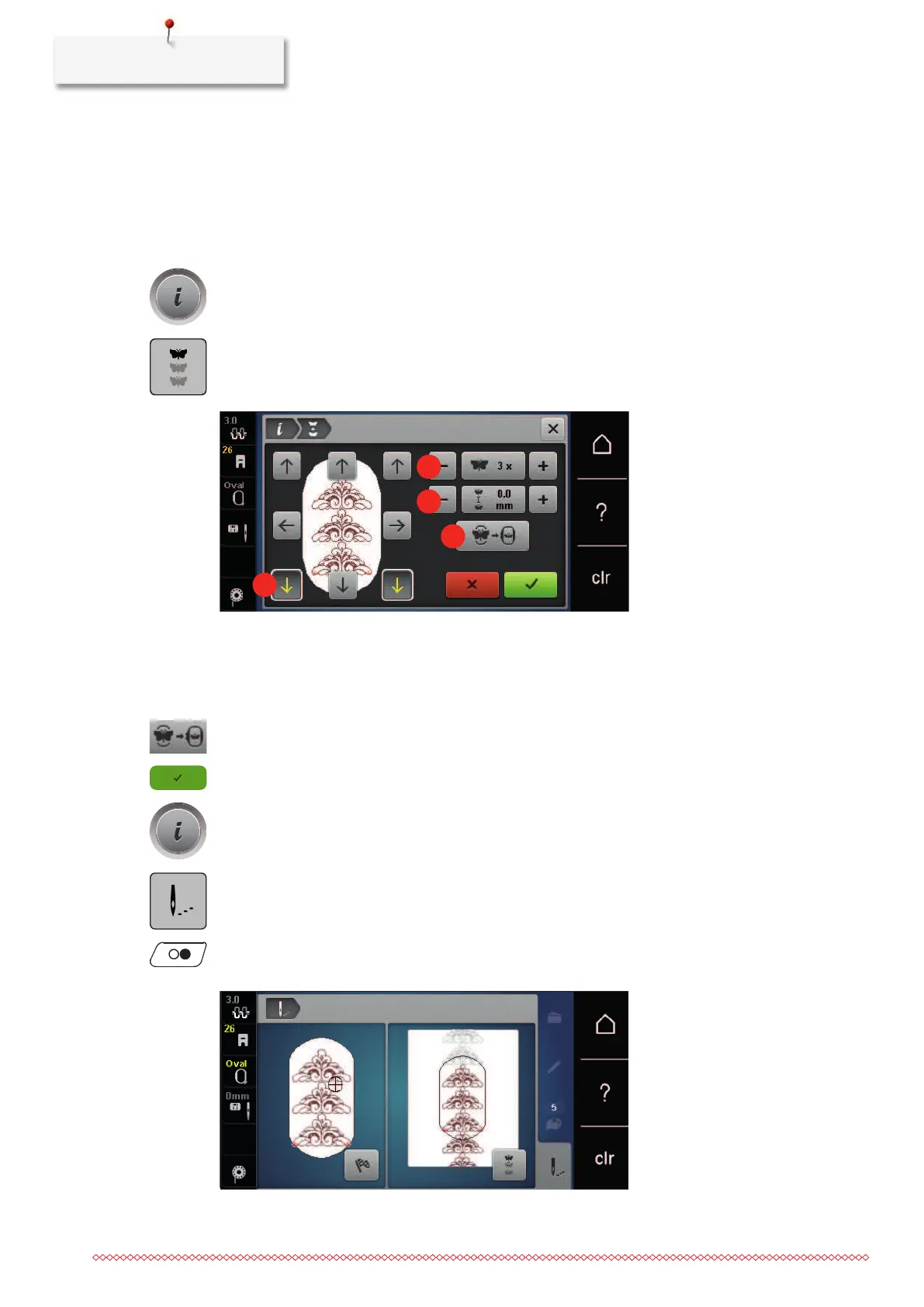 > touch the icons «-/+» (3) to set the distance between the embroidery motifs.