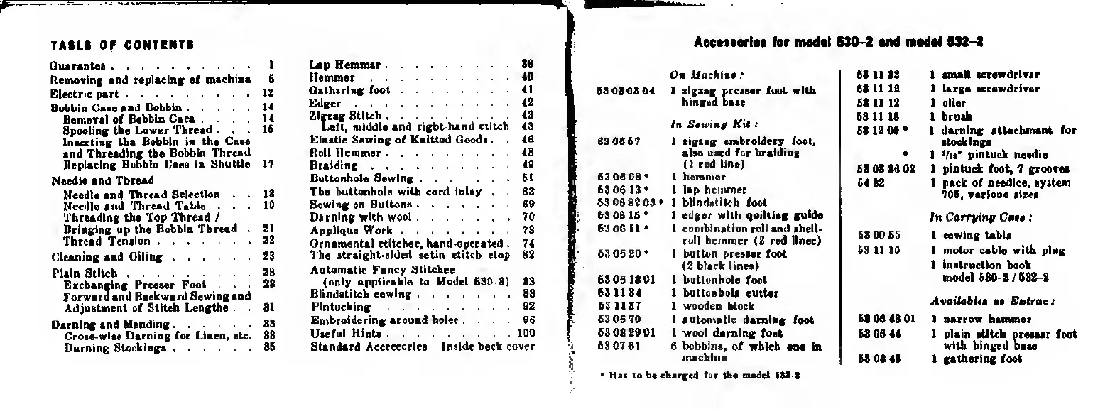 Bernina 530-2 - Accessories for model 530-2 and model 532-2