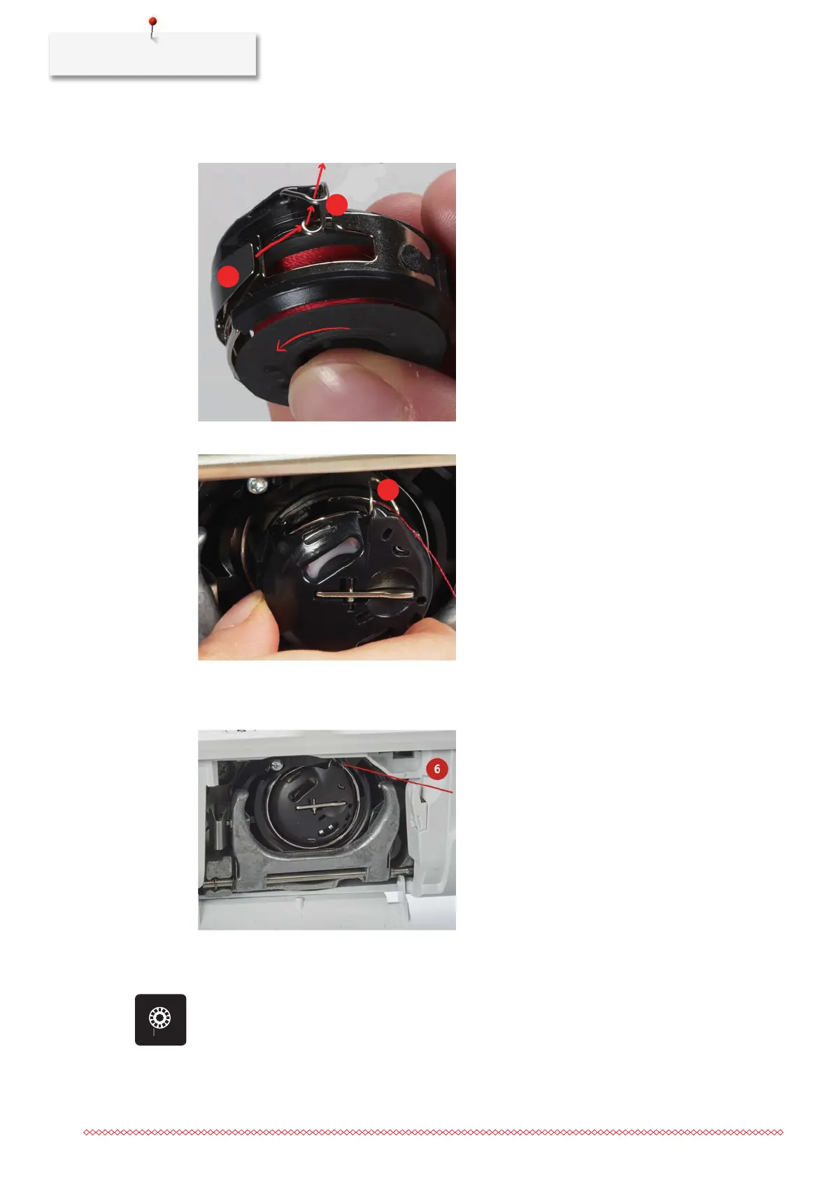 > When inserting into the machine, hold the bobbin case so the thread guide (5) points upwards.