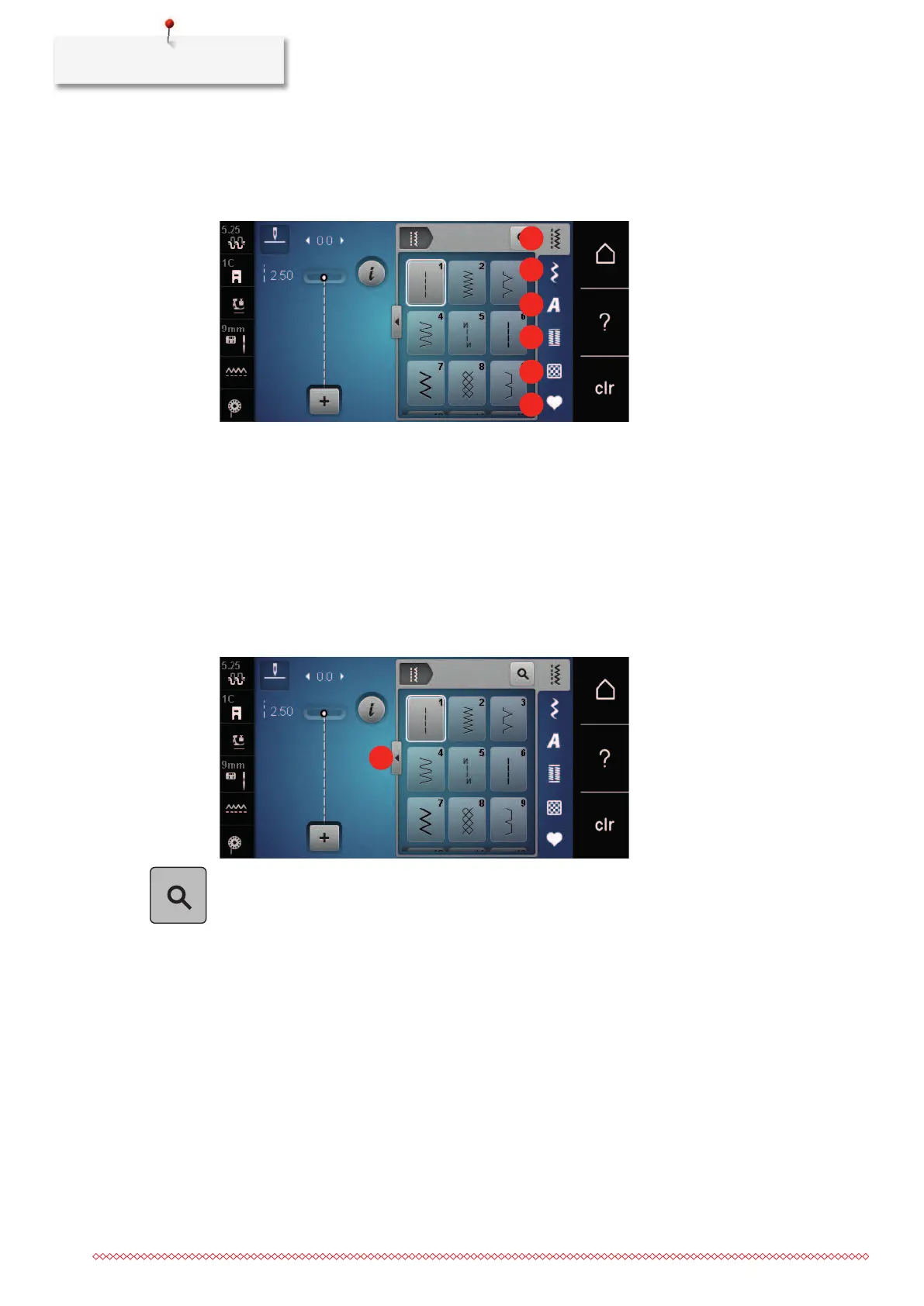 > Touch the icon «Display all the stitch patterns» (1) to scale up the view.
