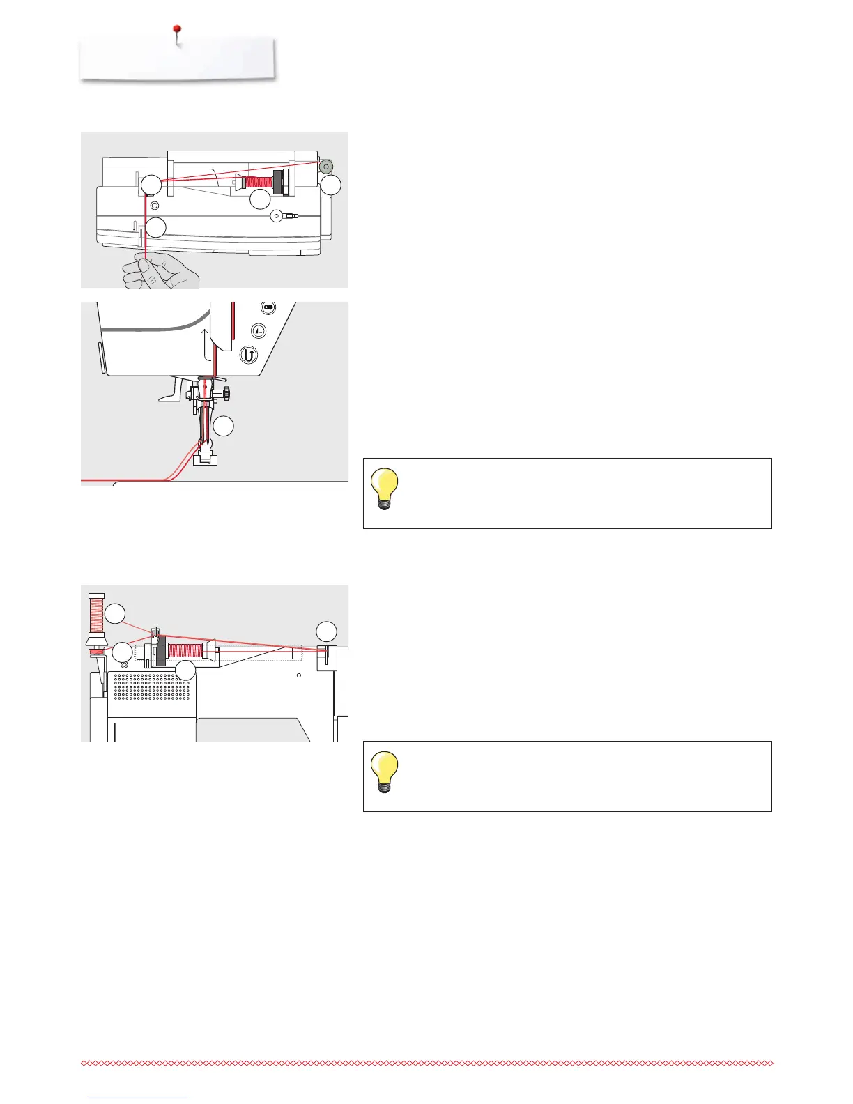 guide the thread to the front in the slit and past the tension disc 1 on the