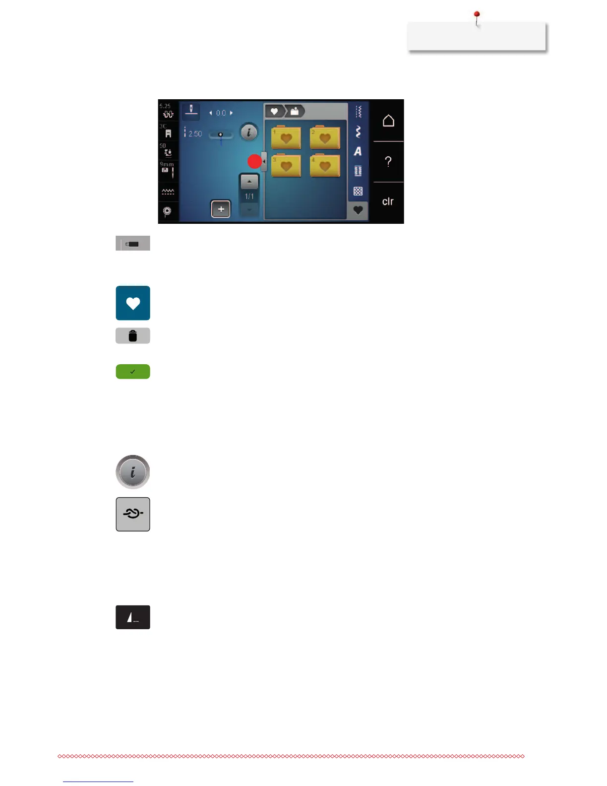 – While sewing, a stop icon indicates that the function is activated and the stitch pattern or the current