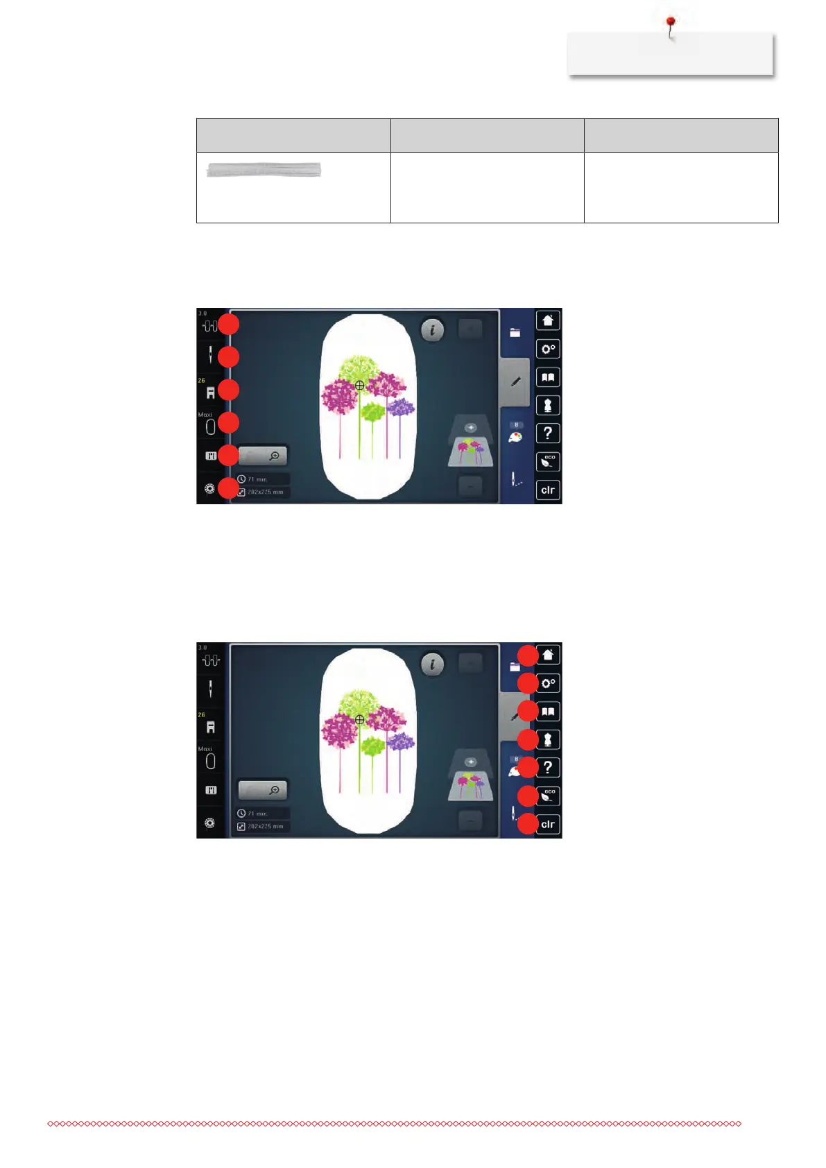 3 Presser foot display/Presser foot selection 6 Fill level of bobbin thread