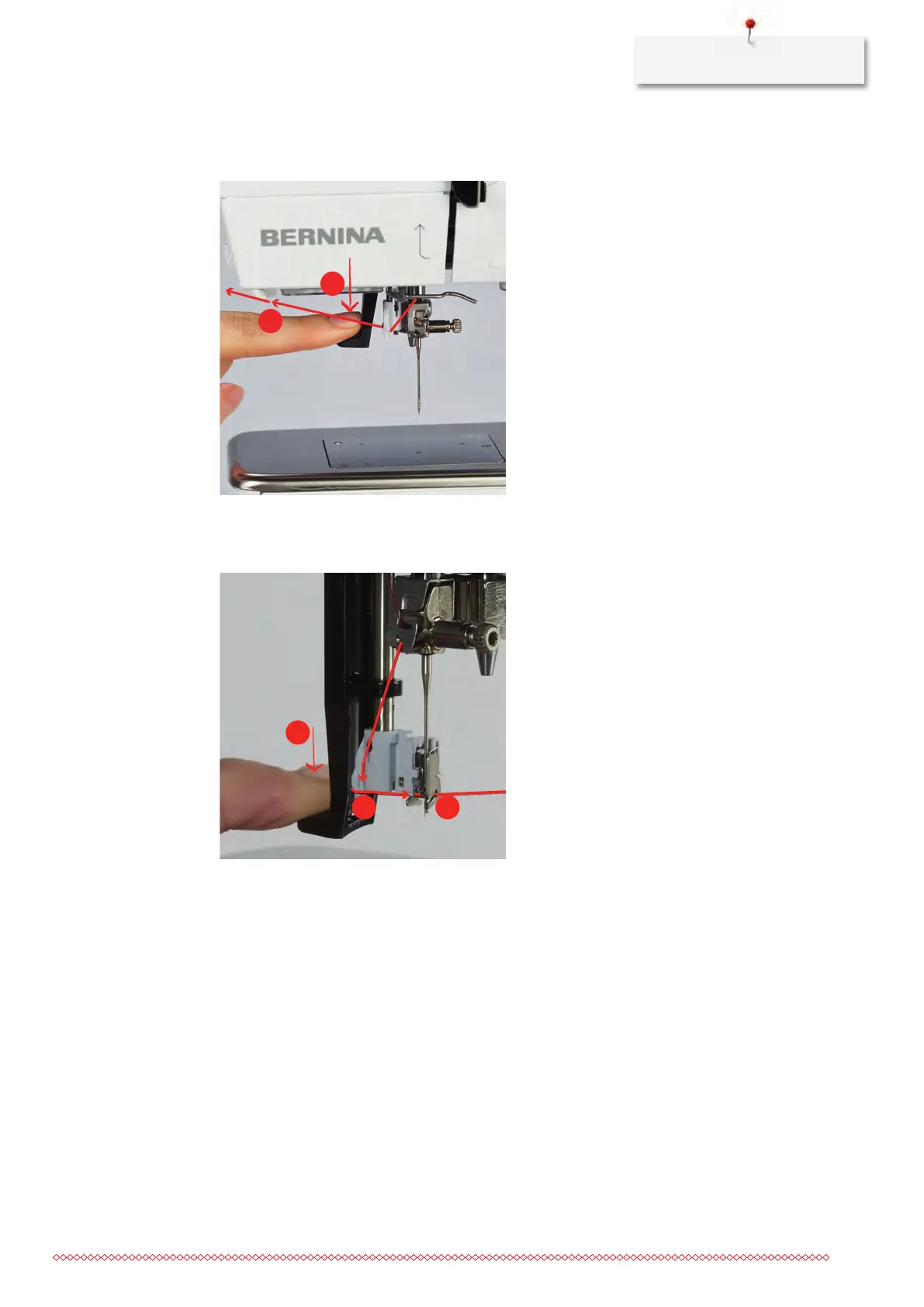 > Press the threader lever down as far as it will go (11) and then pull the thread from the left to the right