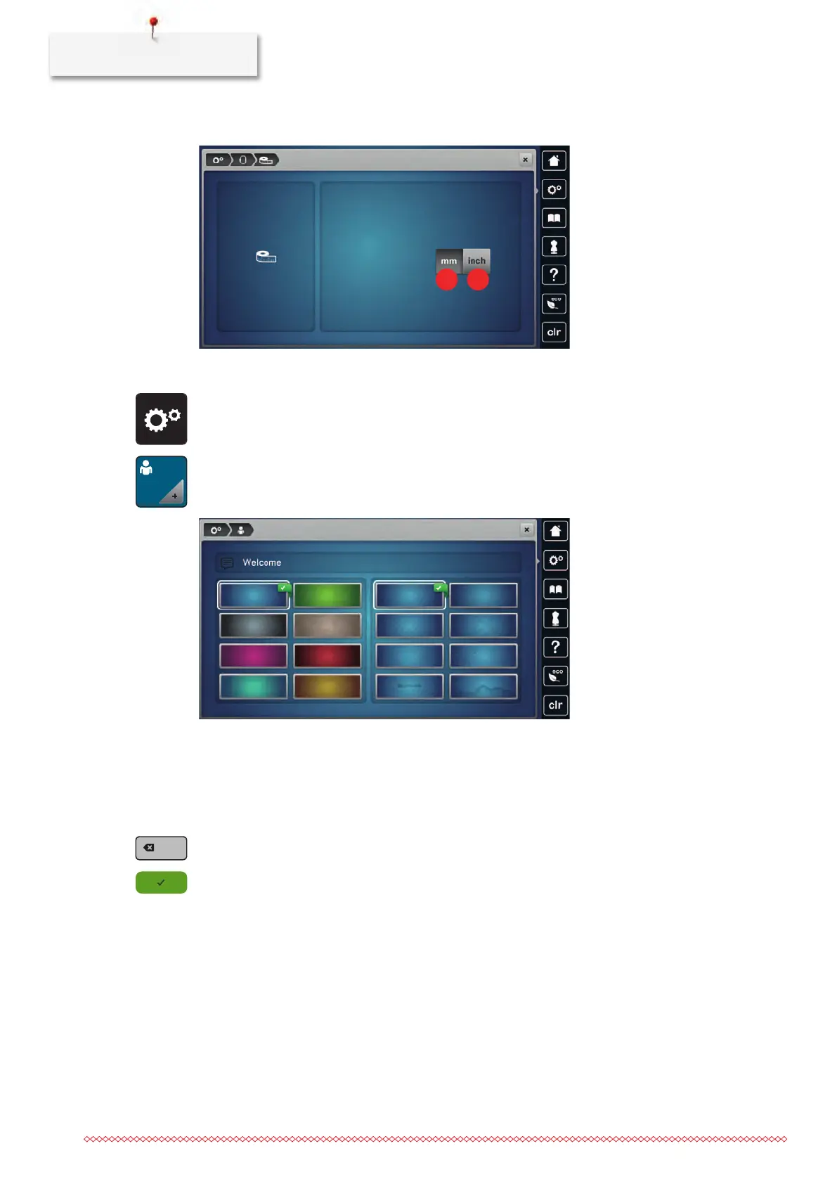 > Touch the icon «mm» (1) to change the measuring unit in the embroidery mode to mm.