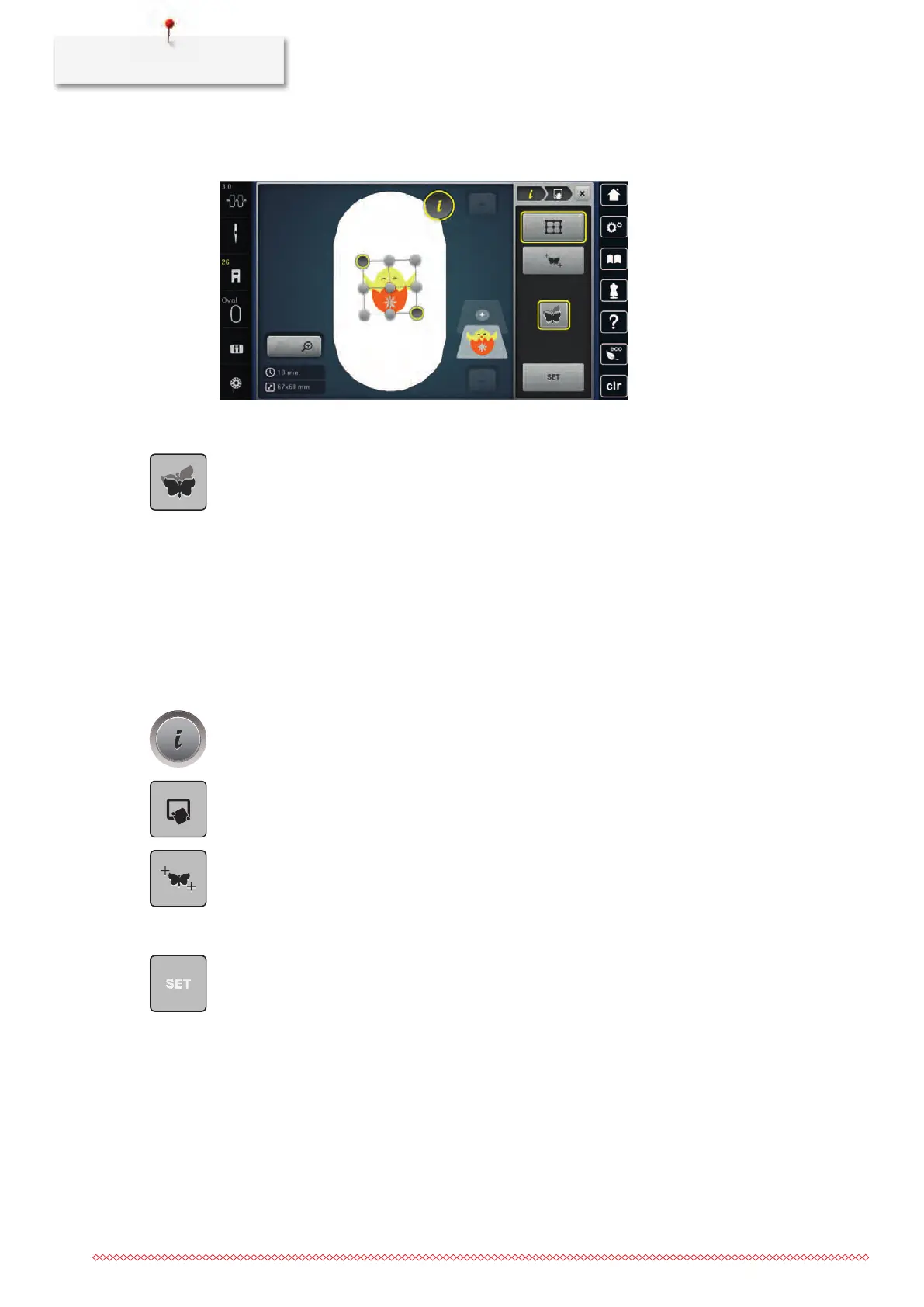 This function allows the exact positioning of the embroidery motif on the fabric in an easy way. The points