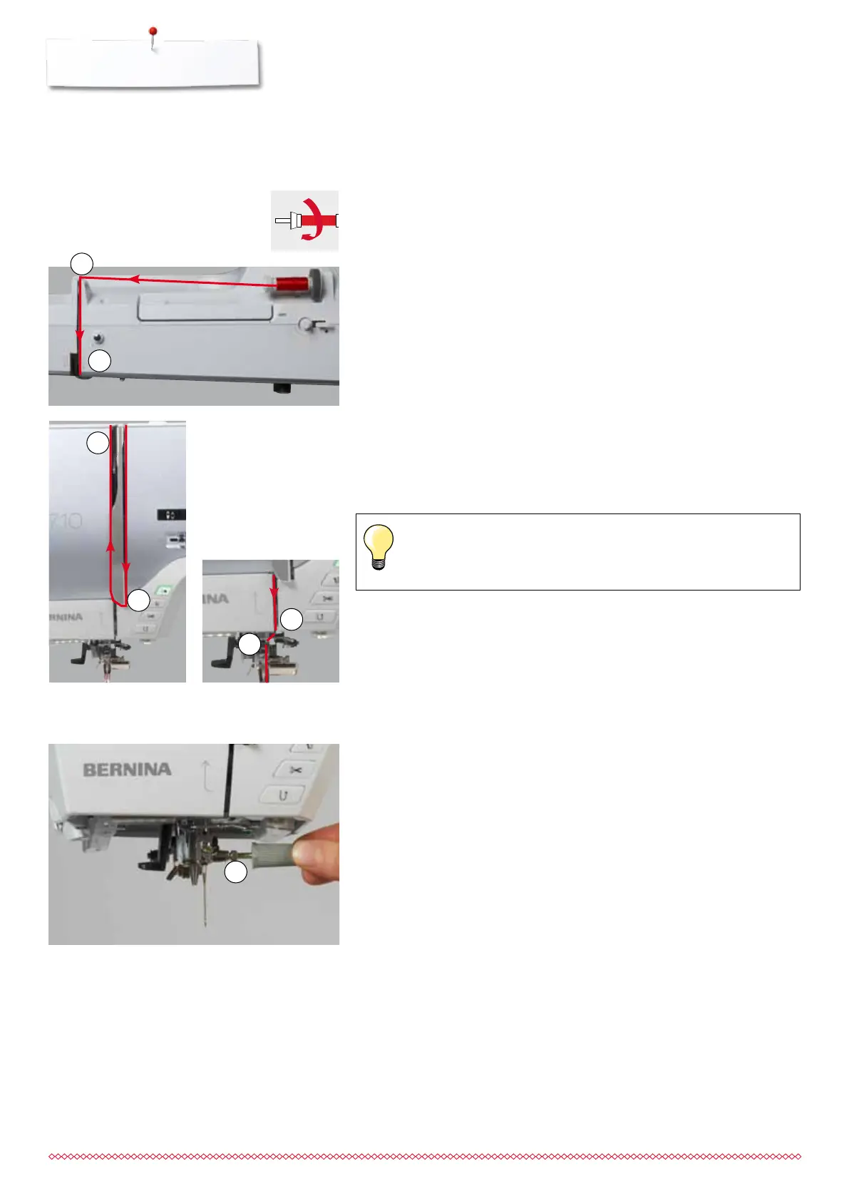 take thread up to the left of the cover and around 4, placing it in the take-up