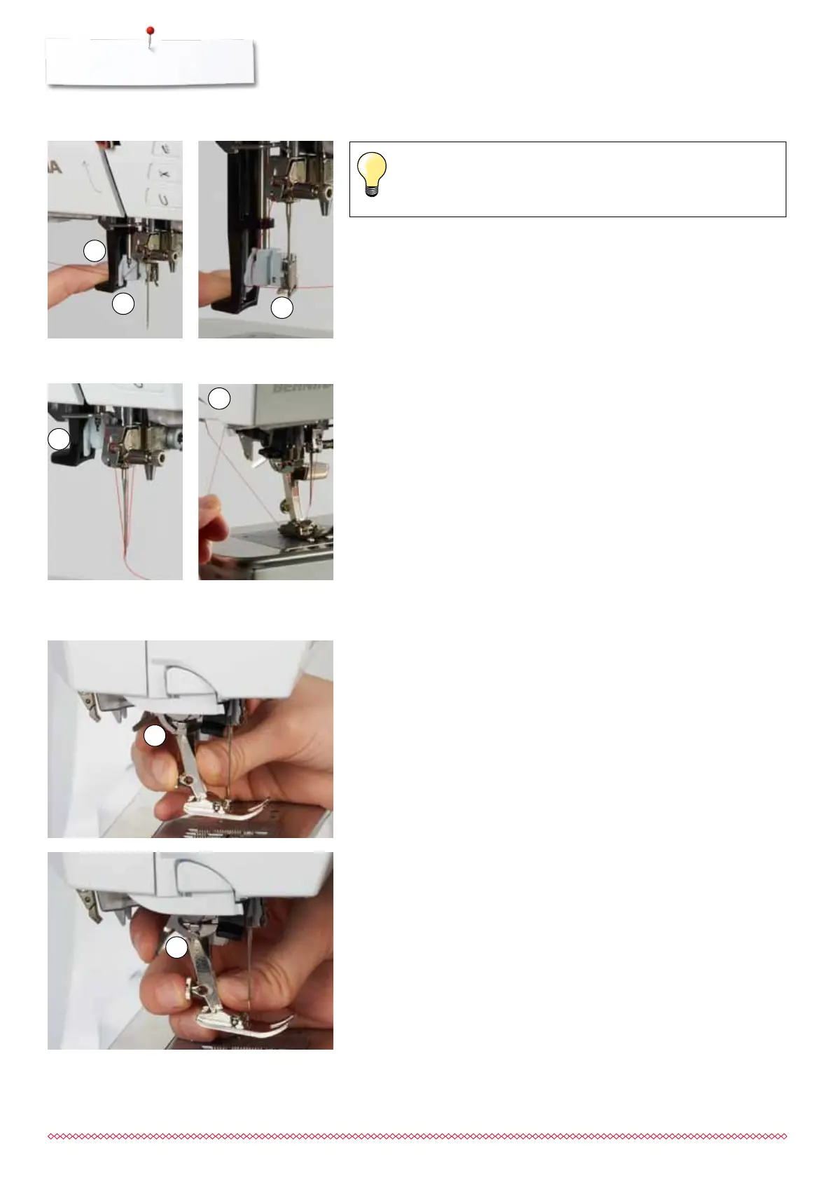 put the thread from the front into the guide 3 until it catches in the wire hook