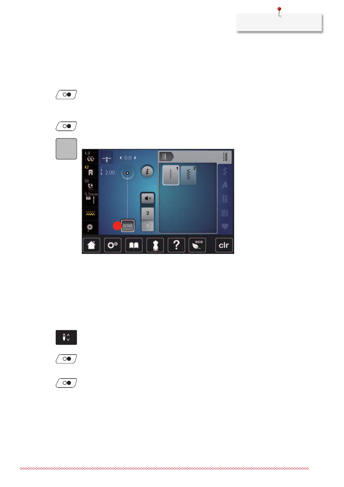 – The BSR Mode stops and the red light at the presser foot goes off.
