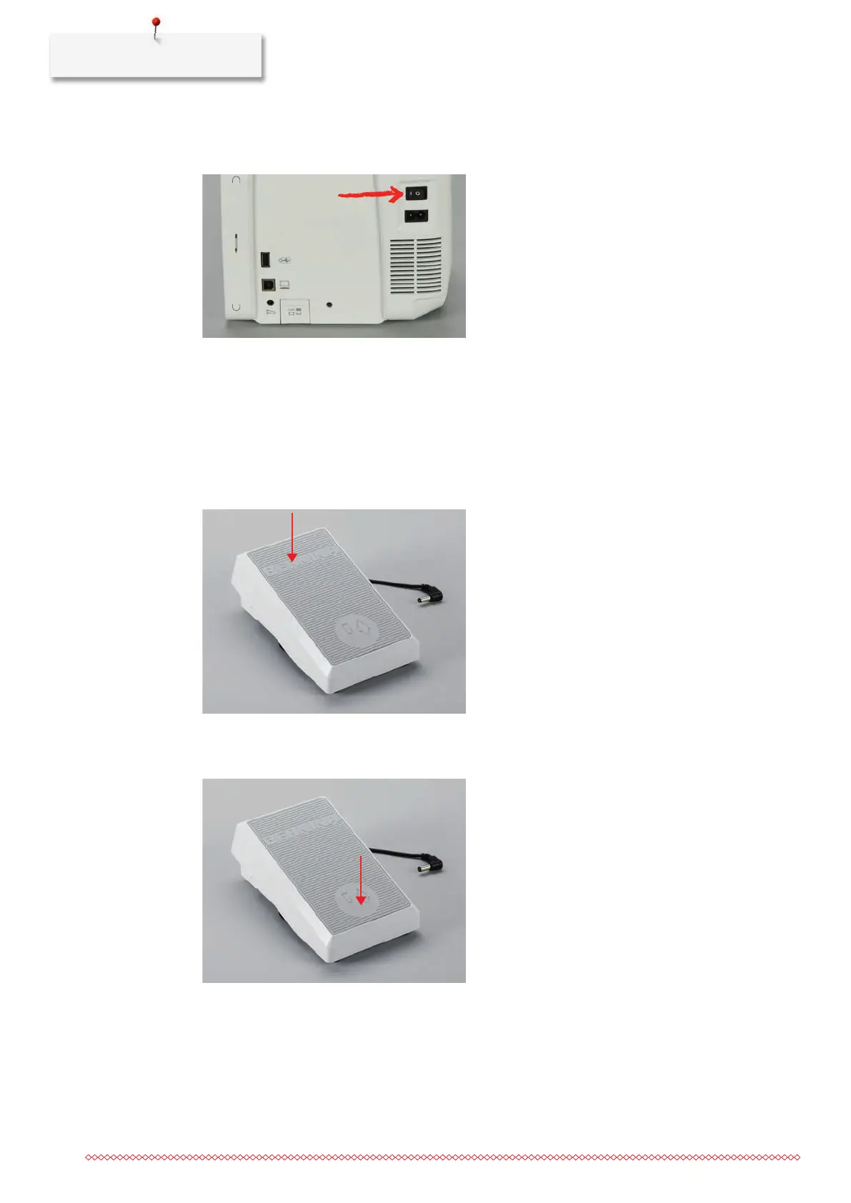 > Press the foot control down carefully to start the machine.