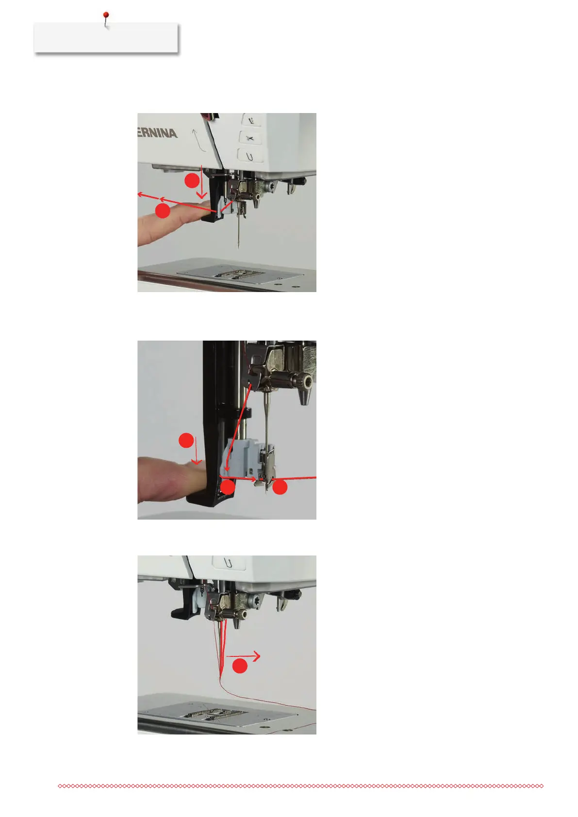 > Press the threader lever down as far as it will go (11) and then pull the thread from the left to the right