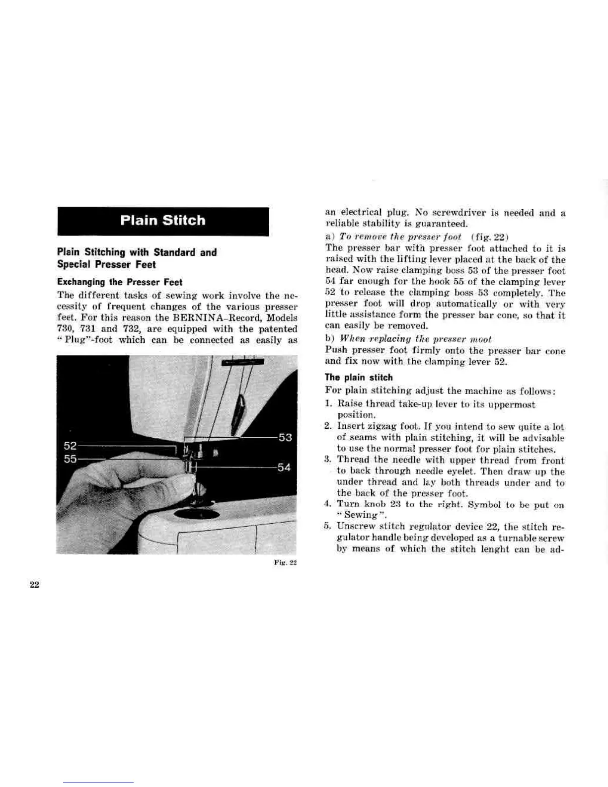 Bernina 730 record - Plain Stitch Sewing and Presser Feet; Exchanging Presser Feet