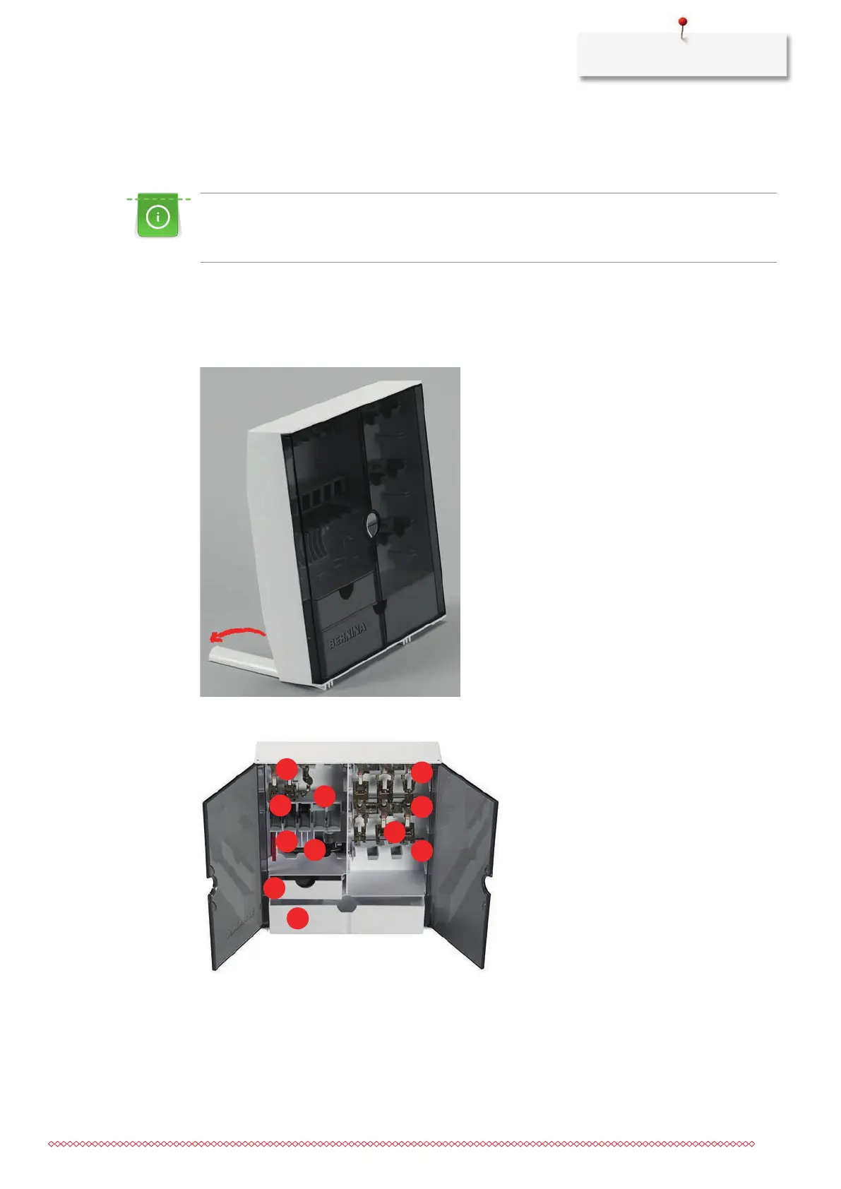 > Store the small parts, e.g. thread discs etc., in the drawers (2) and (3).