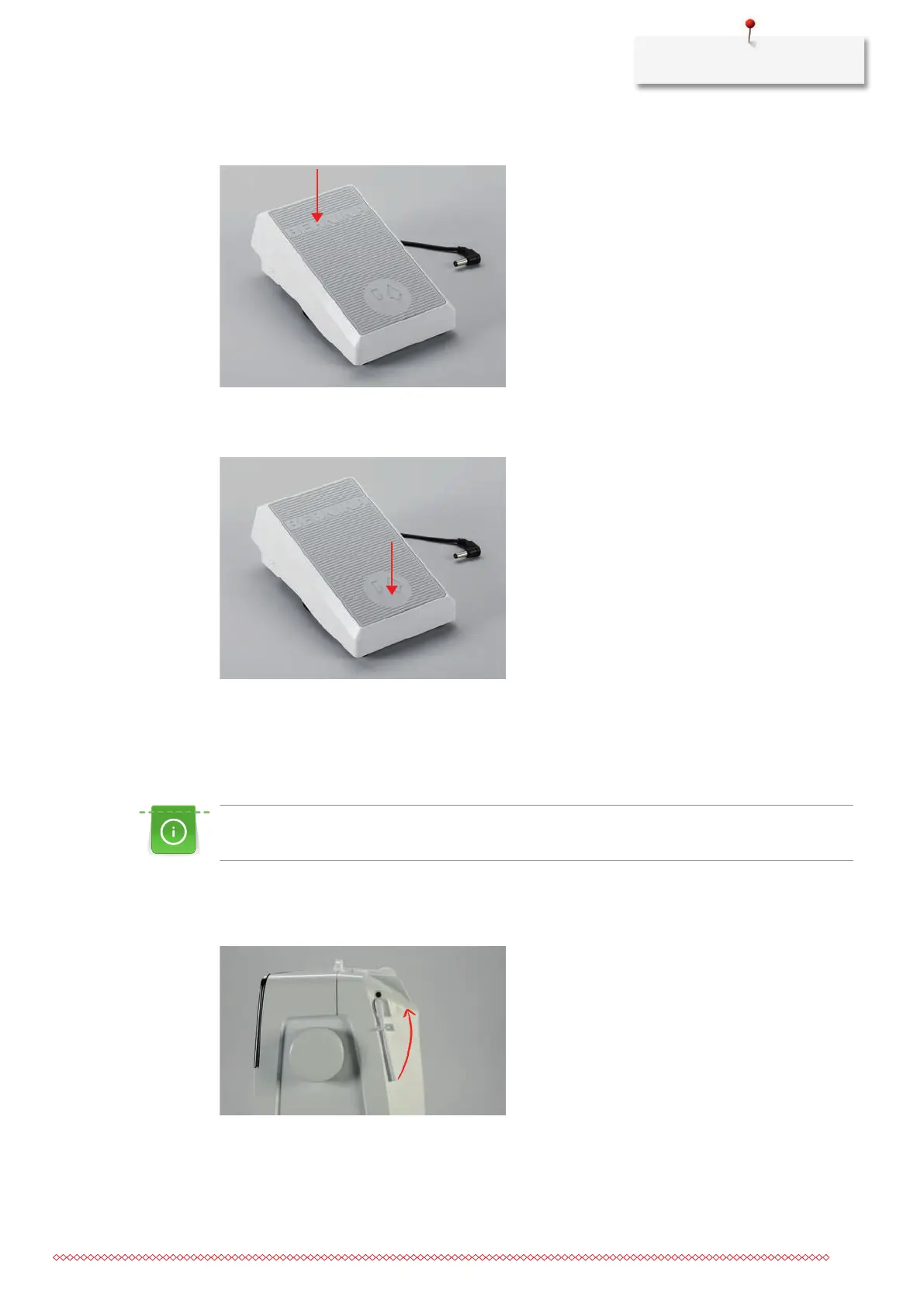 > Sink the heel back on the foot control to raise/lower the needle.