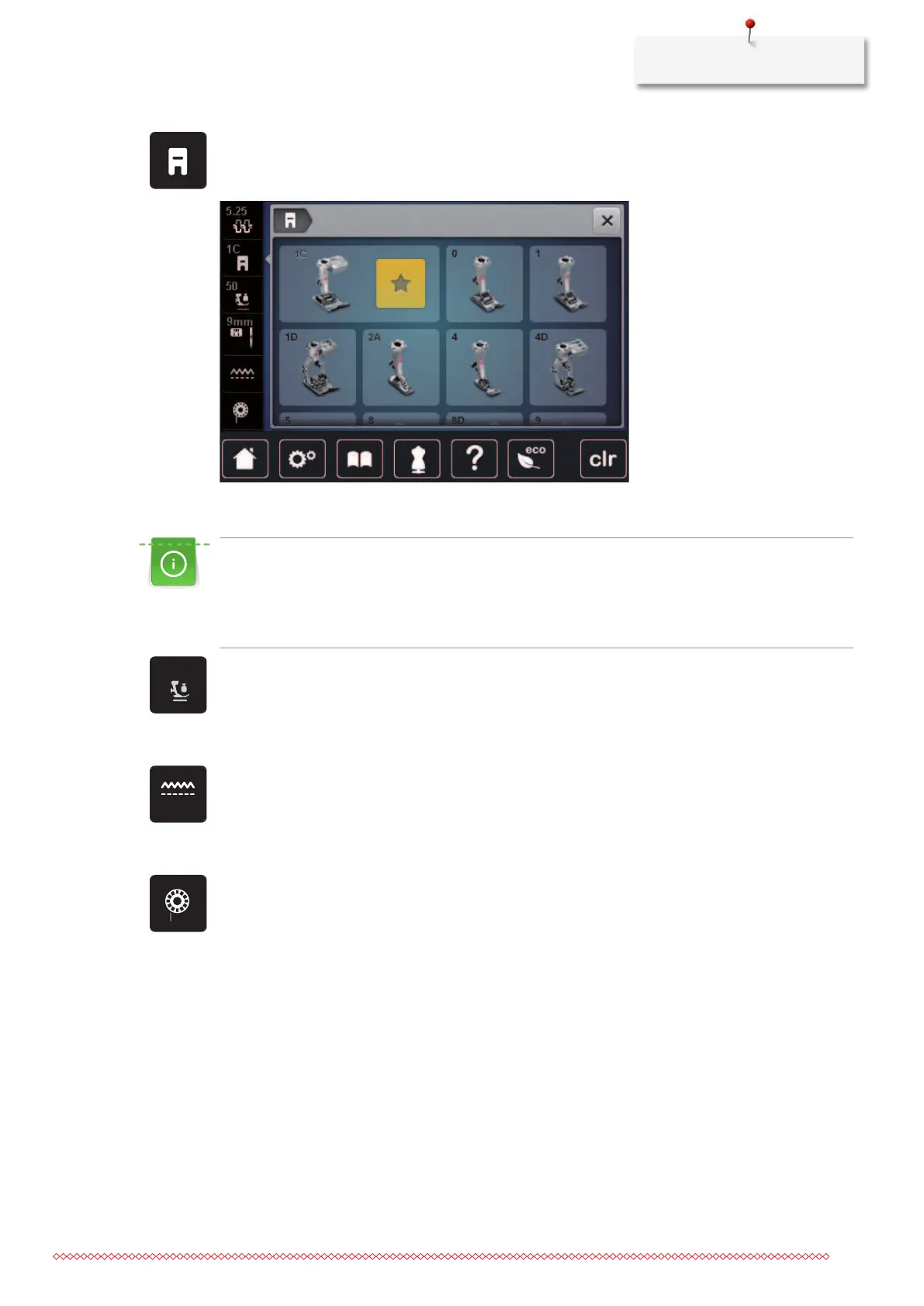 > When a presser foot is tapped, the description and use for that presser foot appears.