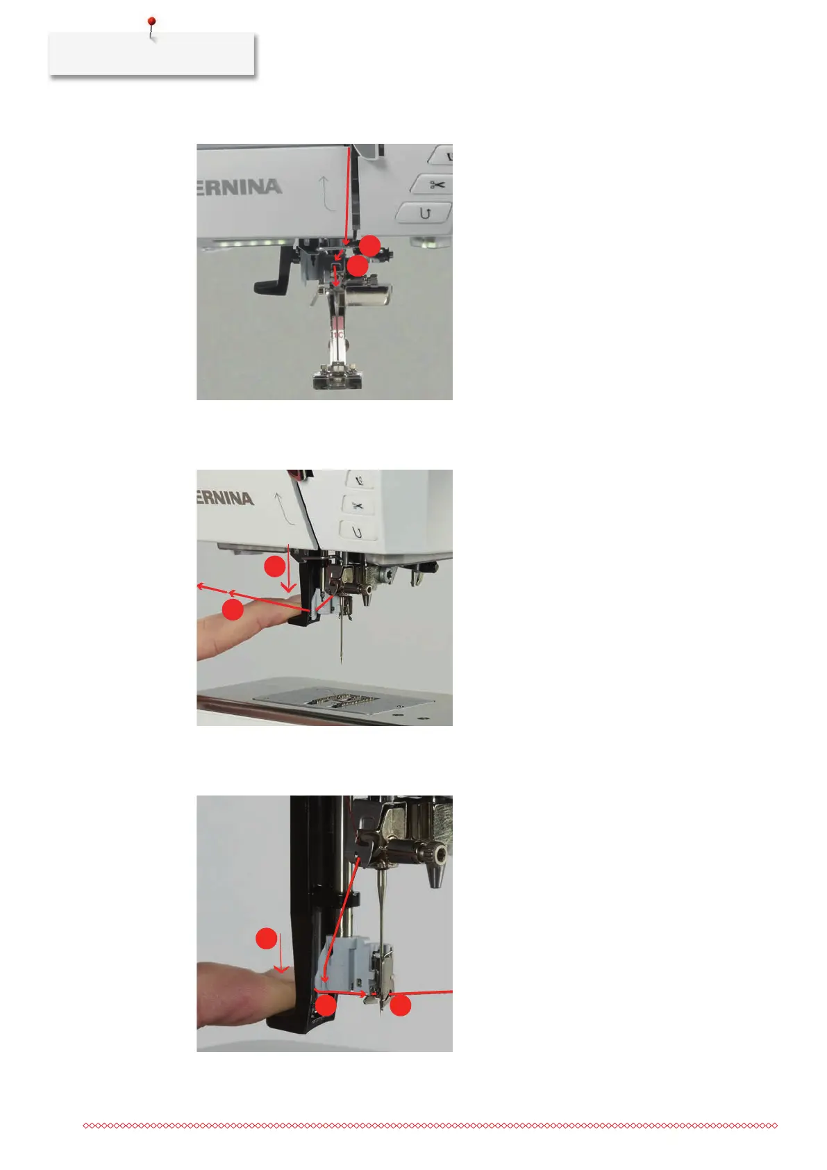 > Press the threader lever down as far as it will go (11) and then pull the thread from the left to the right