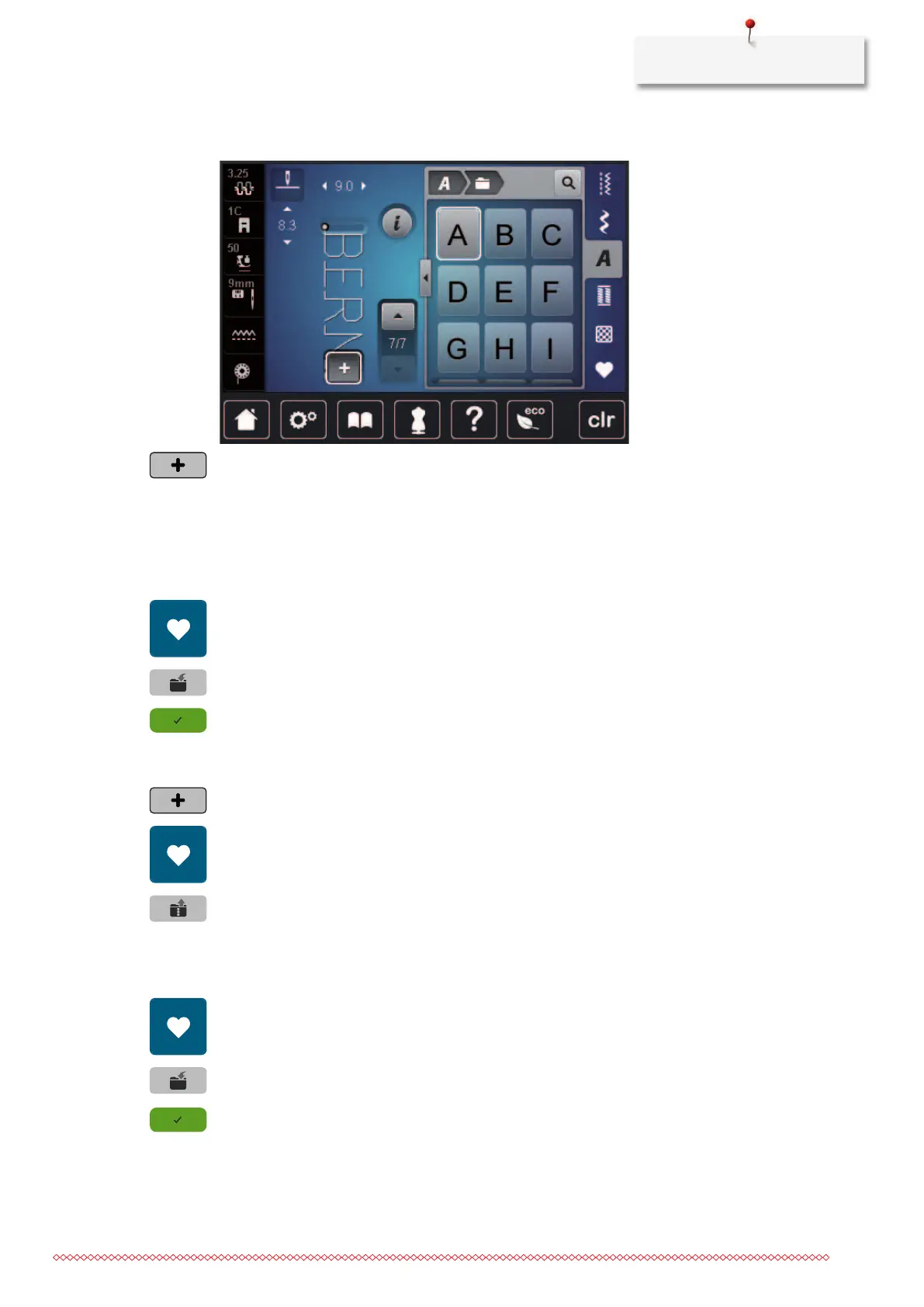 To use an individually created stitch pattern combinations again, they can be saved in the folder «Personal