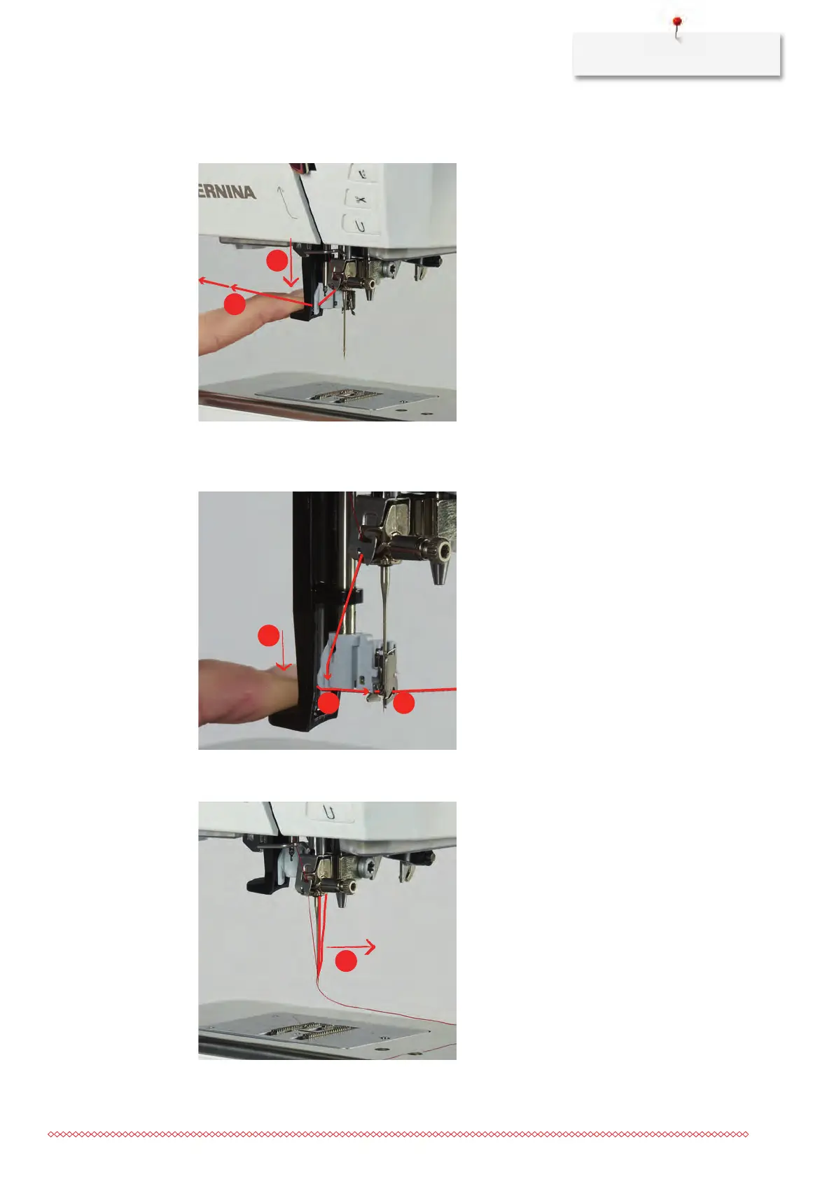 > Press the threader lever down as far as it will go (11) and then pull the thread from the left to the right