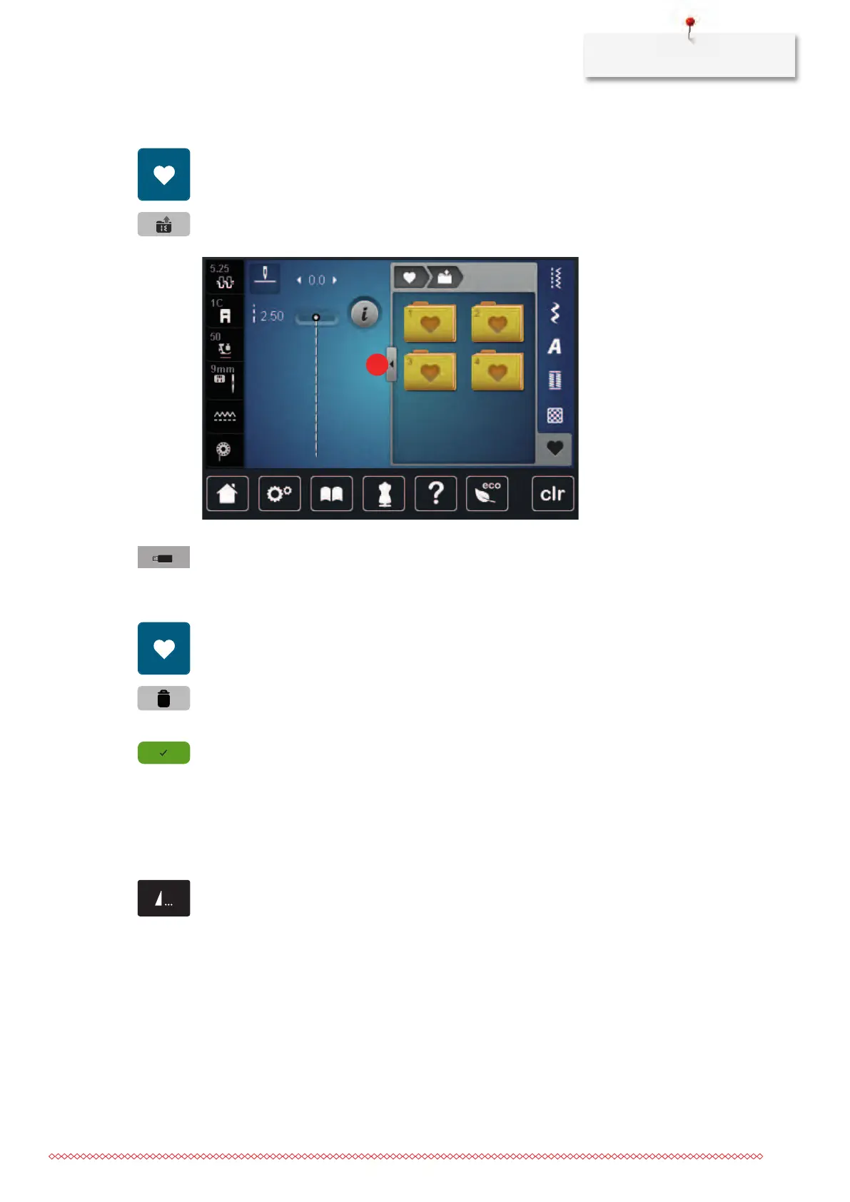 – While sewing, a stop icon indicates that the function is activated and the stitch pattern or the current