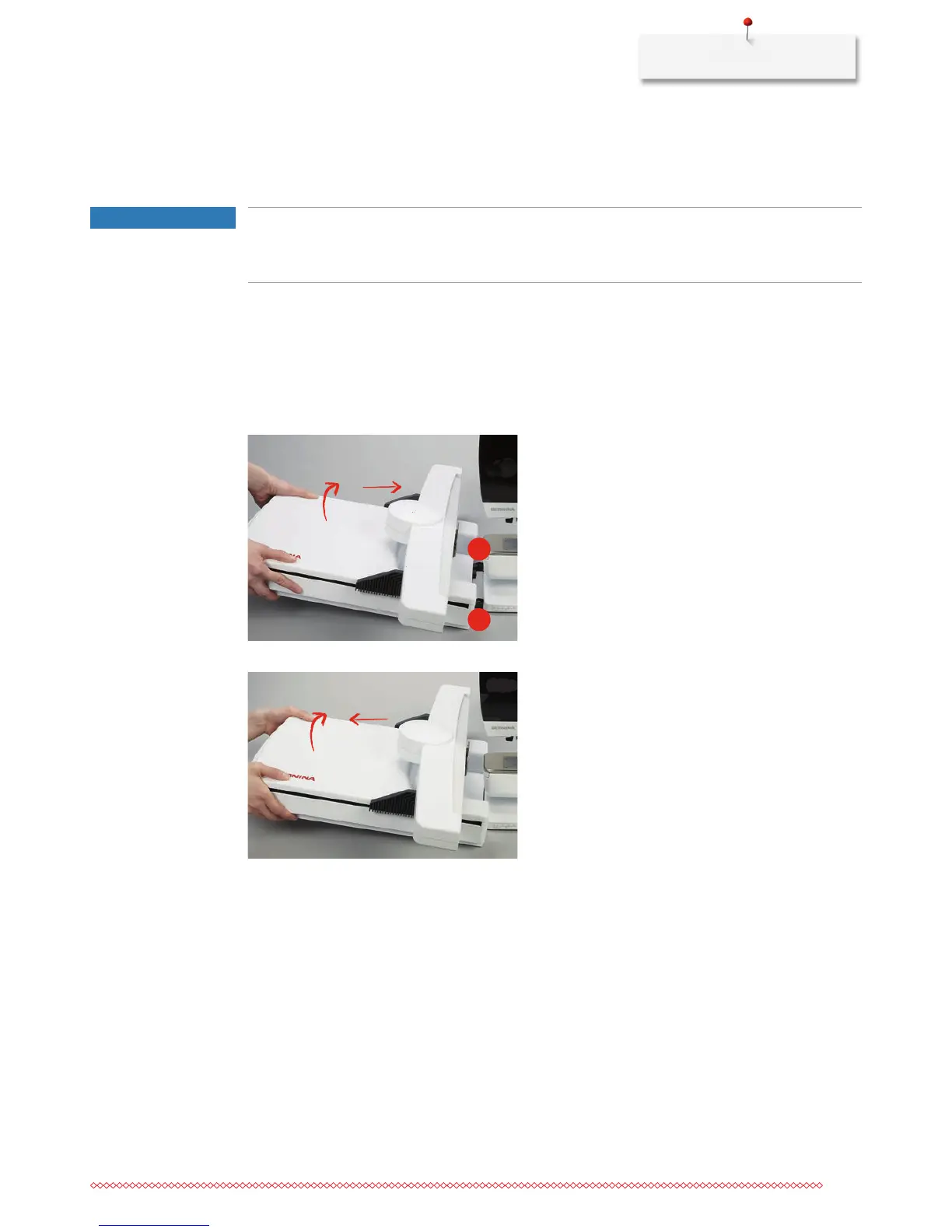 > To remove, lift the embroidery module on the left and carefully pull to the left.