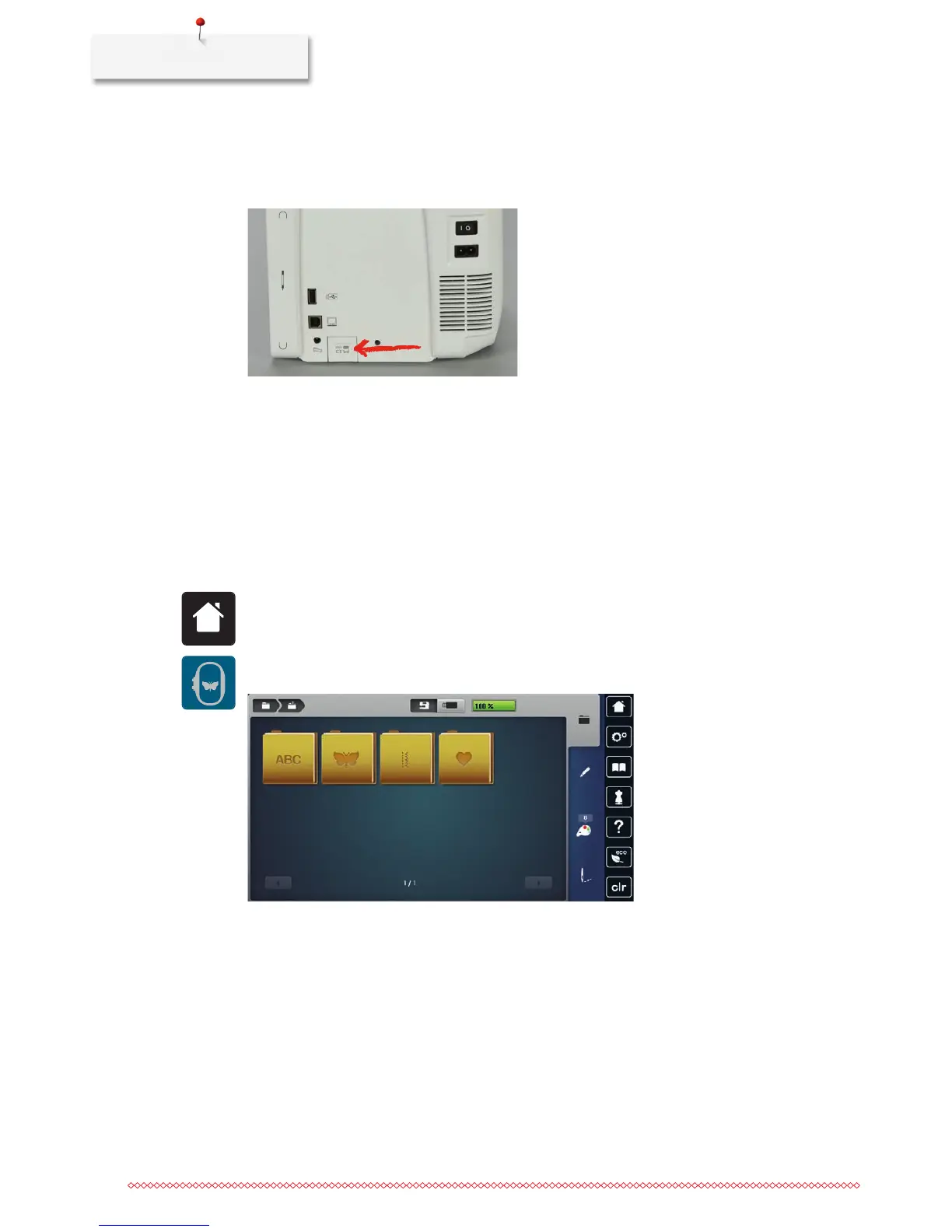 from the personal memory or from the BERNINA USB stick (optional accessory) can be loaded.