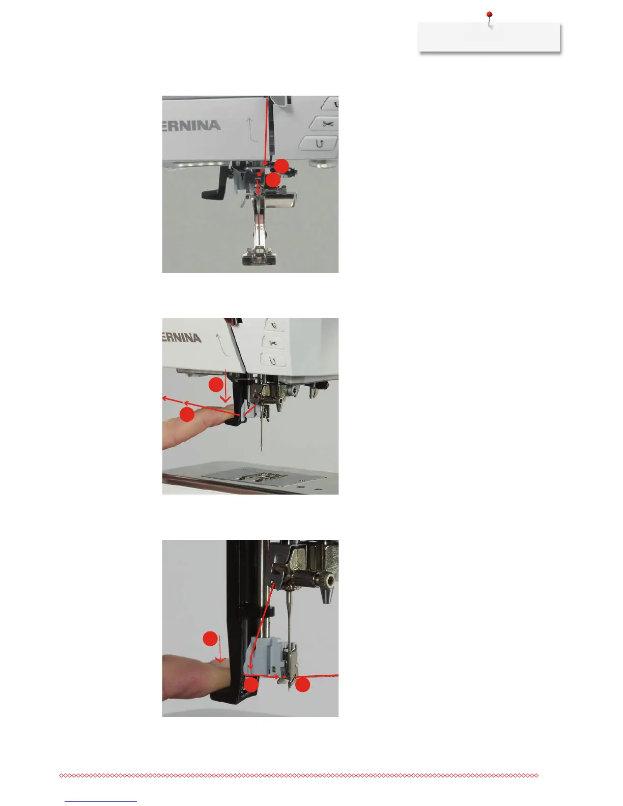 > Press the threader lever down as far as it will go (11) and then pull the thread from the left to the right