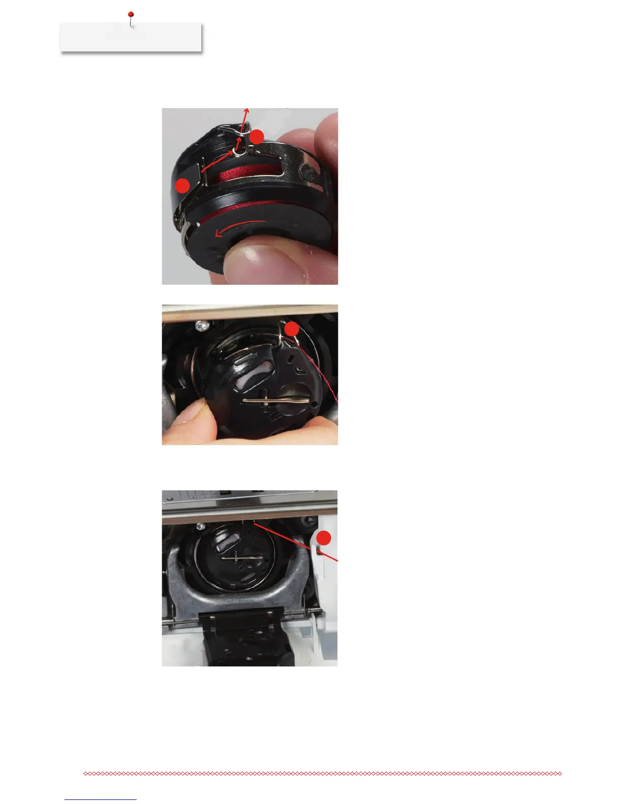 > When inserting into the machine, hold the bobbin case so the the thread guide (5) points upwards.
