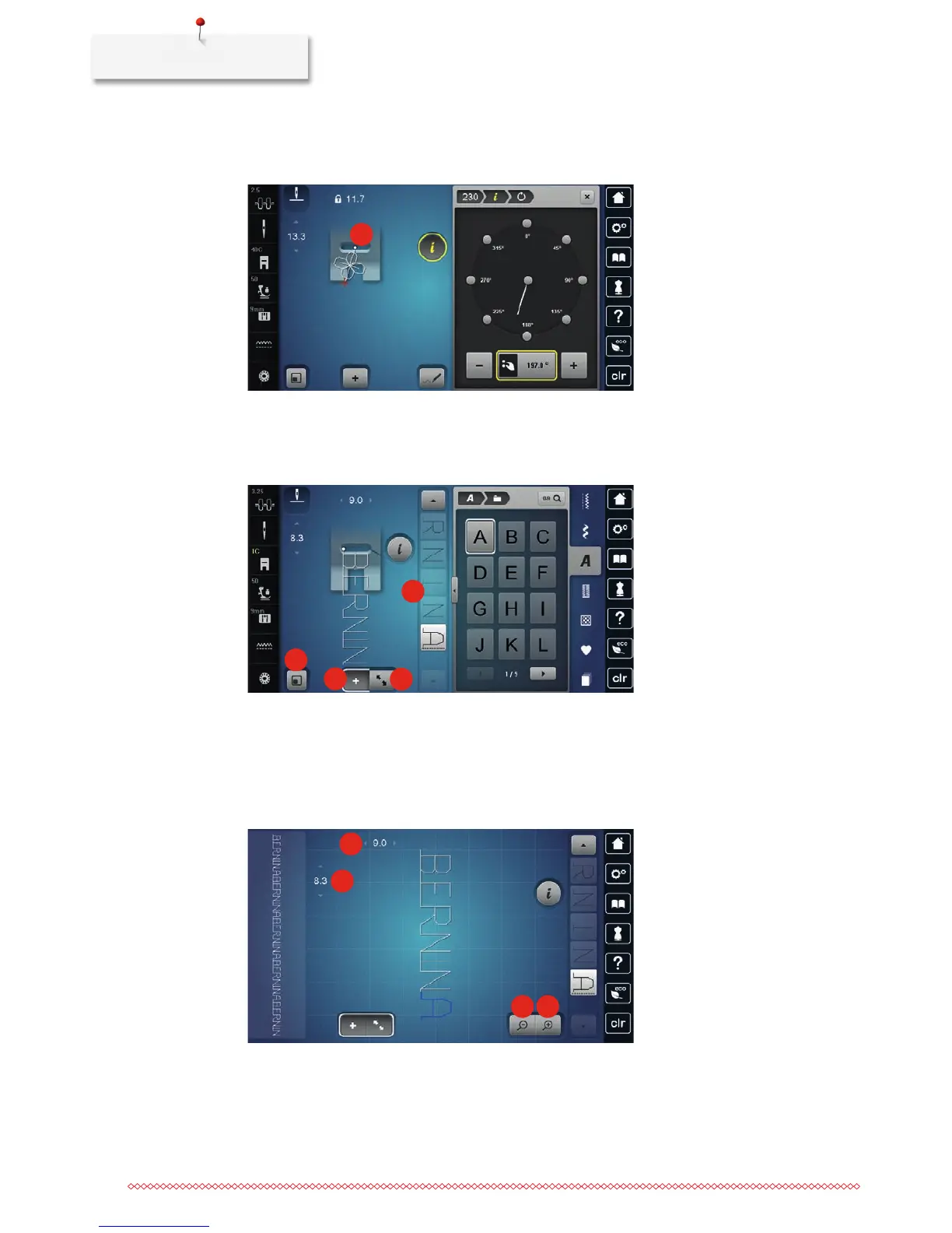 1 Stitch width of the active stitch pattern 3 Zoom out