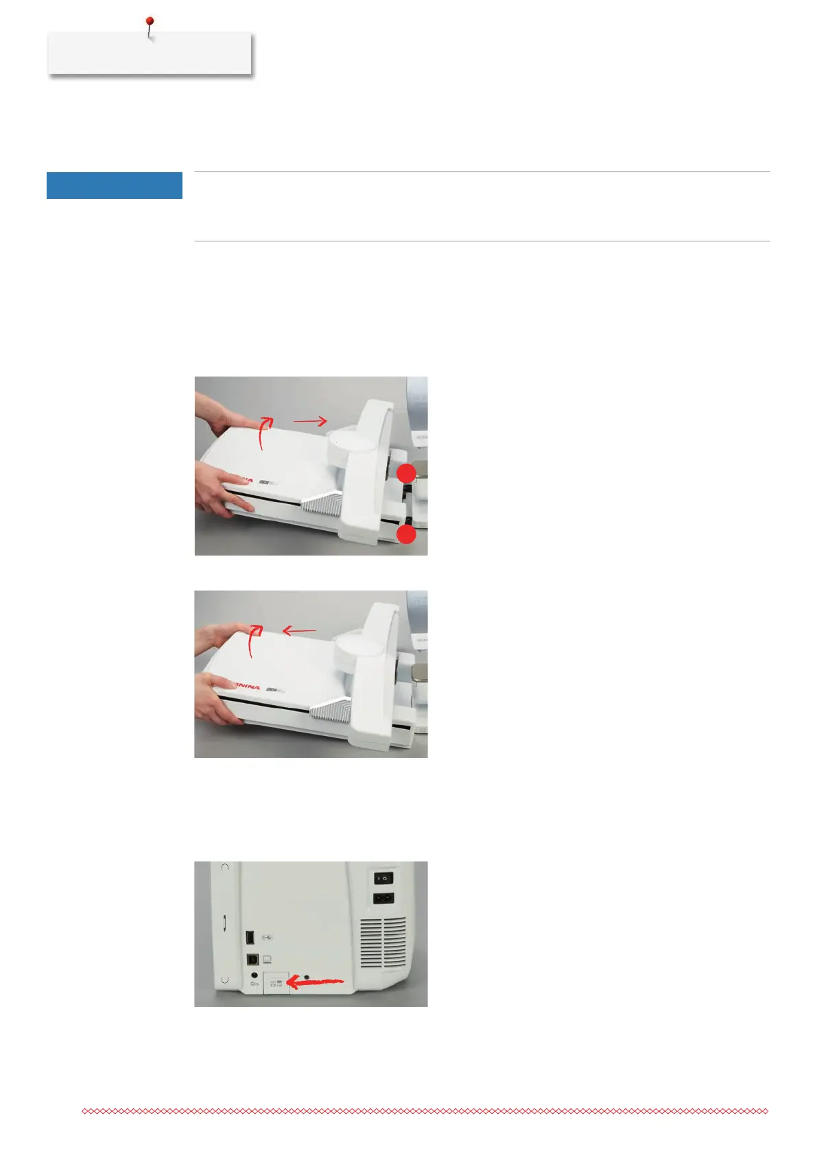 > To remove, lift the embroidery module on the left and carefully pull to the left.