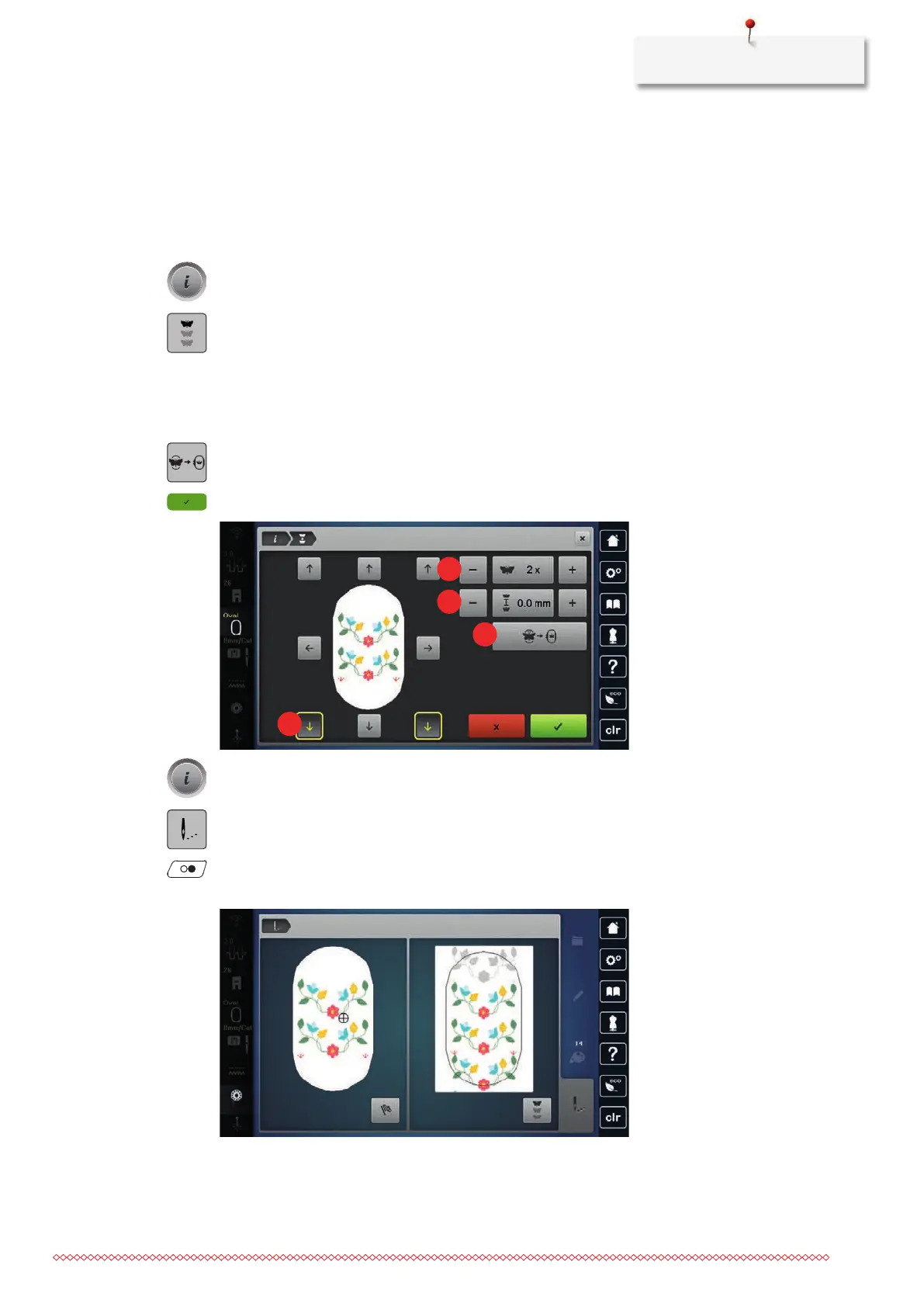 > To specify the distance between the embroidery designs, tap «Minus»/«Plus»(3).