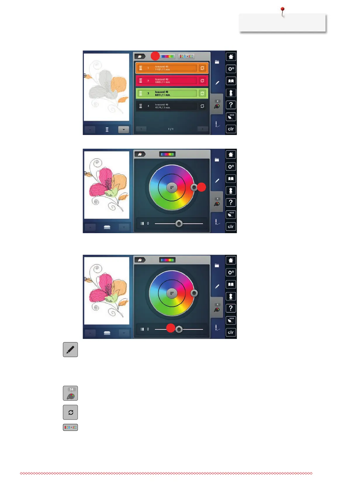 > To change the colors of the embroidery design, turn the knob(2) clockwise or counterclockwise.