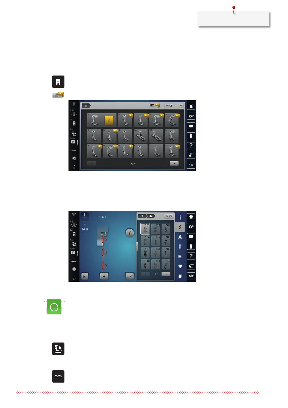 > To display all suitable presser feet for the selected stitch pattern, tap «Optional Presser Feet».