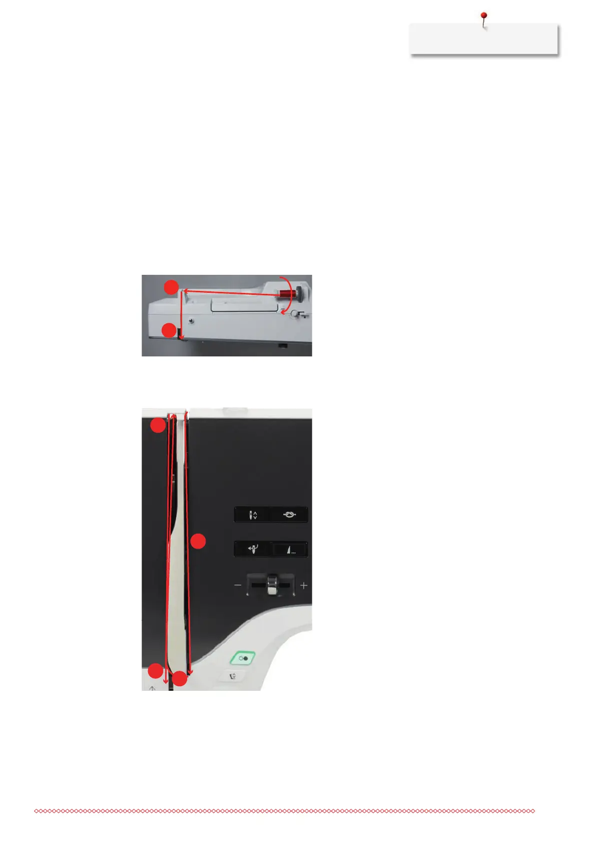 > Guide the thread downwards (3) around the thread take-up lever cover(4).