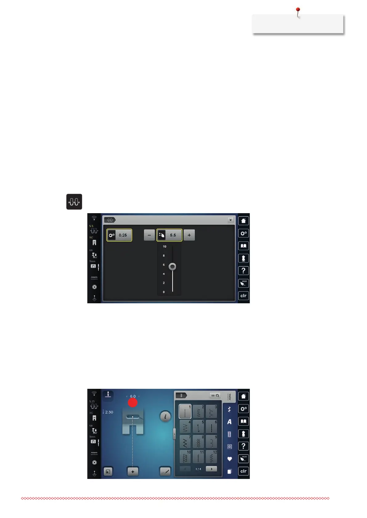 > To call up further setting options, tap the icon «Stitch width» (1).