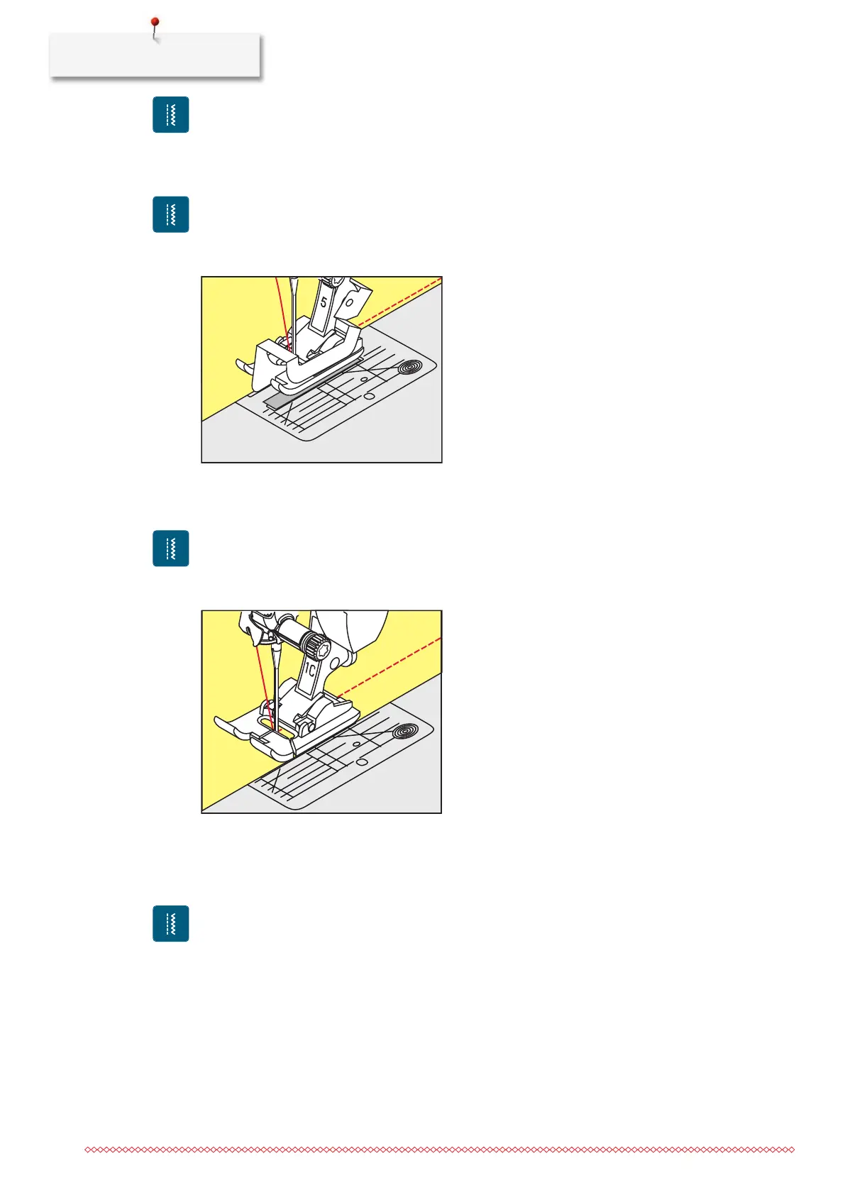 > Guide the edge along the presser foot or at a distance of 1– 2.5cm along the marks on the stitch plate.