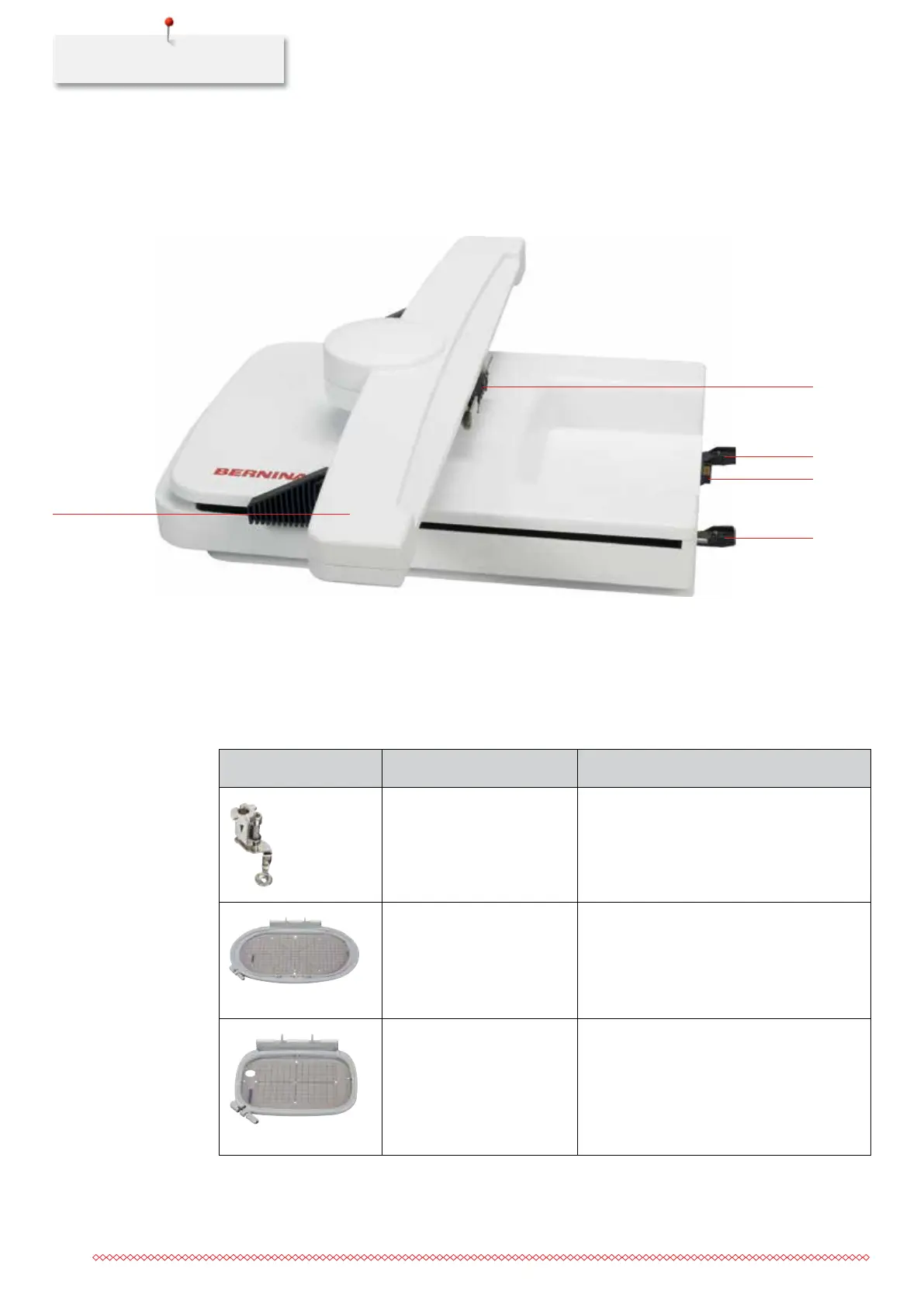 2 Bracket for attaching the embroidery hoop 4 Connection to the machine