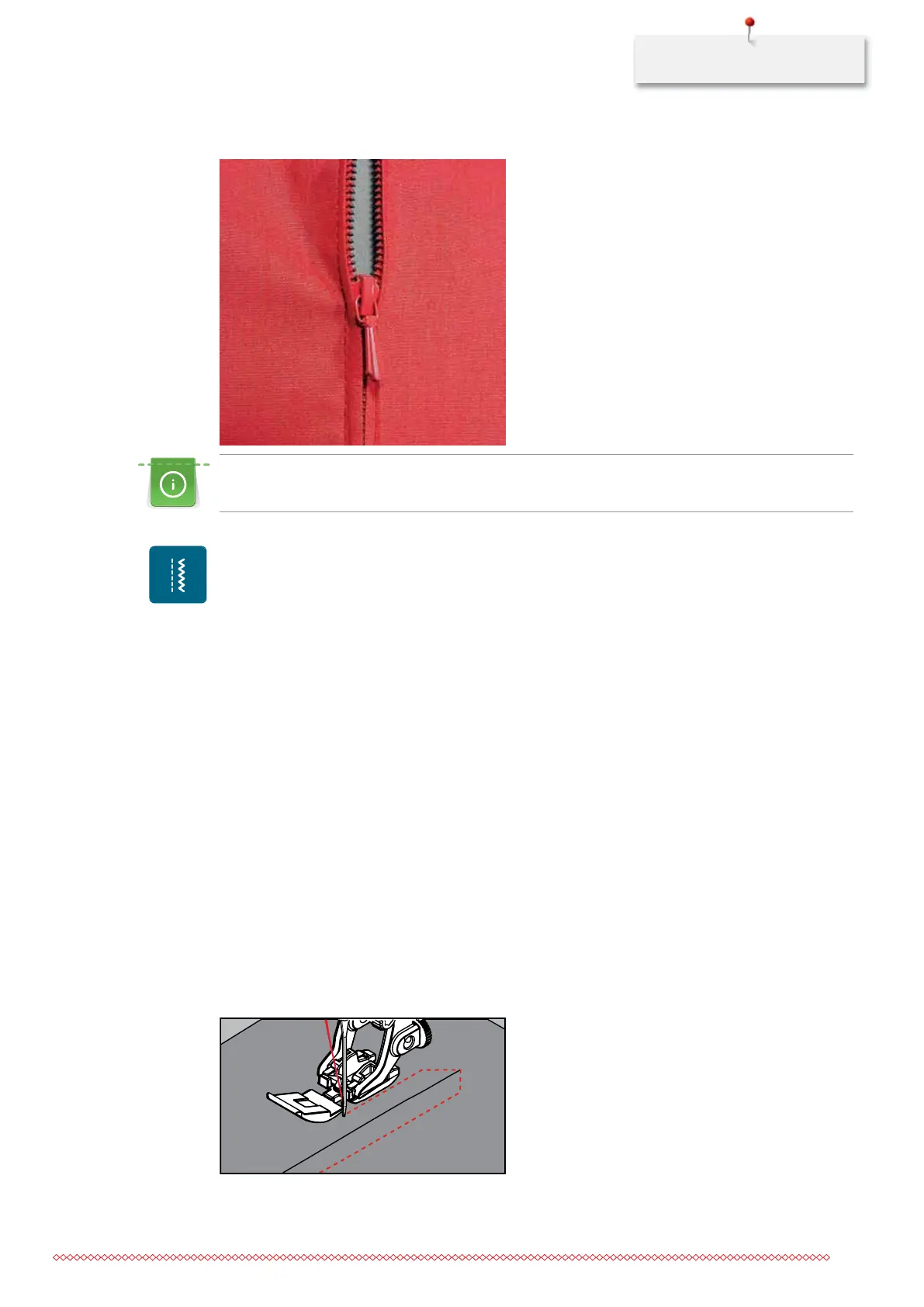 > Continue to sew and stop in front of the base of the zipper with needle position down.