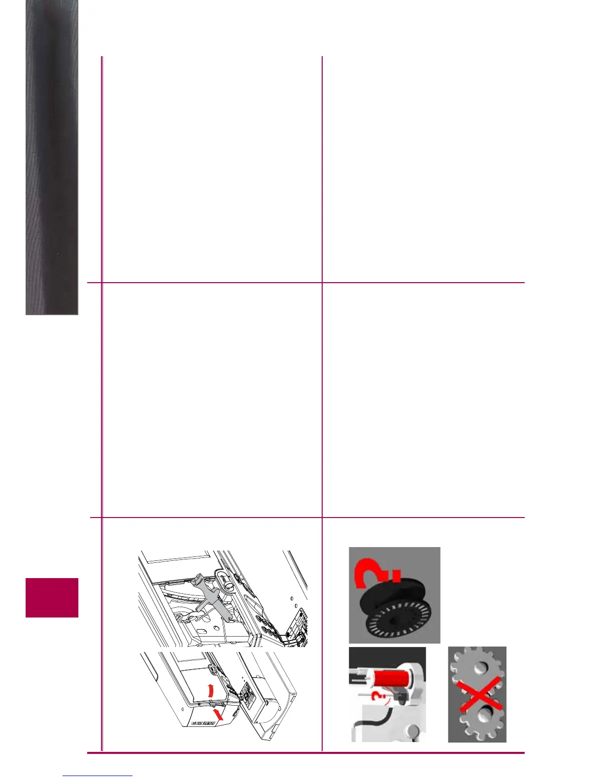 Thread is caught in the hook area Remove the cover to the left of the screen as follows: