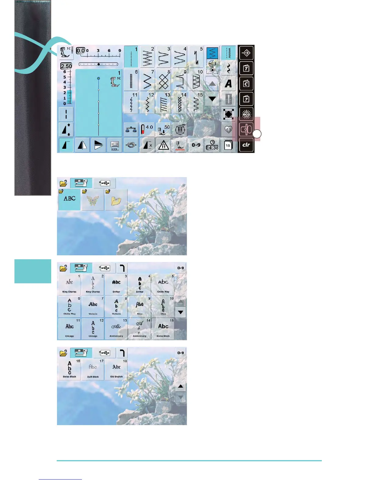 Bernina 830LE - Display; Embroidery Alphabet; Entry to Embroidery Mode
