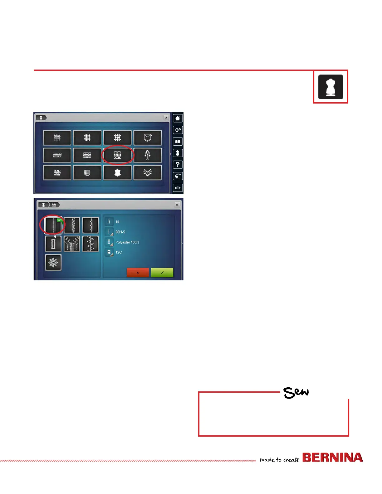 fabric and the desired sewing technique, suggestions for suitable needle, Presser Foot, etc. are displayed.