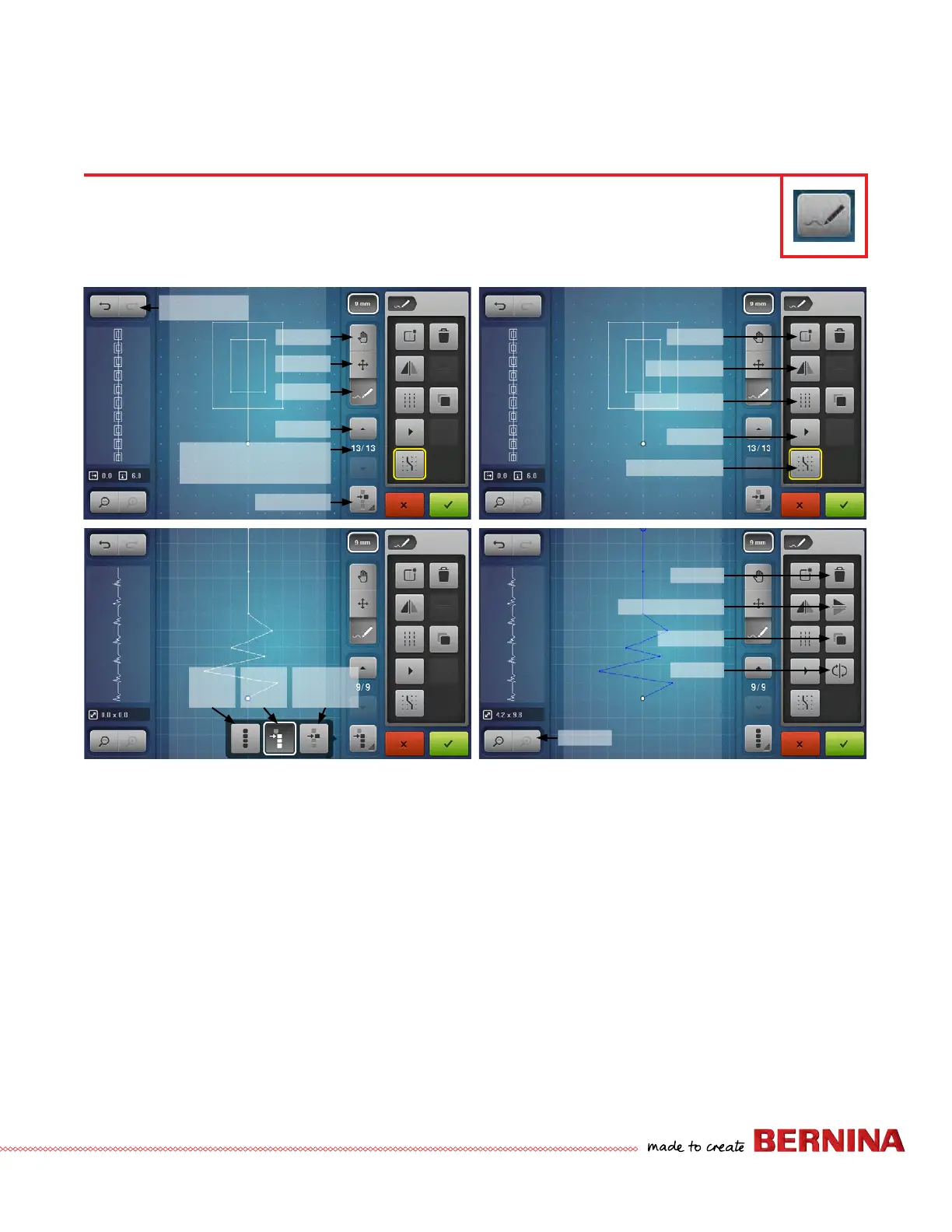 • The line in the middle of the stitch designer drawing area represents the center needle position.