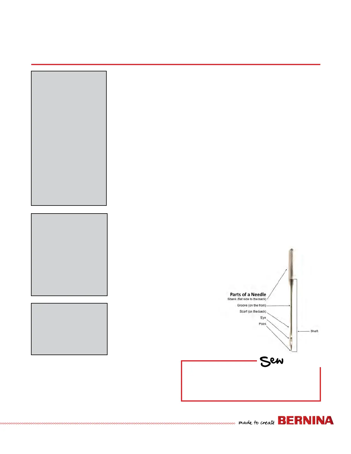 • Blunt – the needle won’t pierce fabric, so no thread loop forms to make a stitch