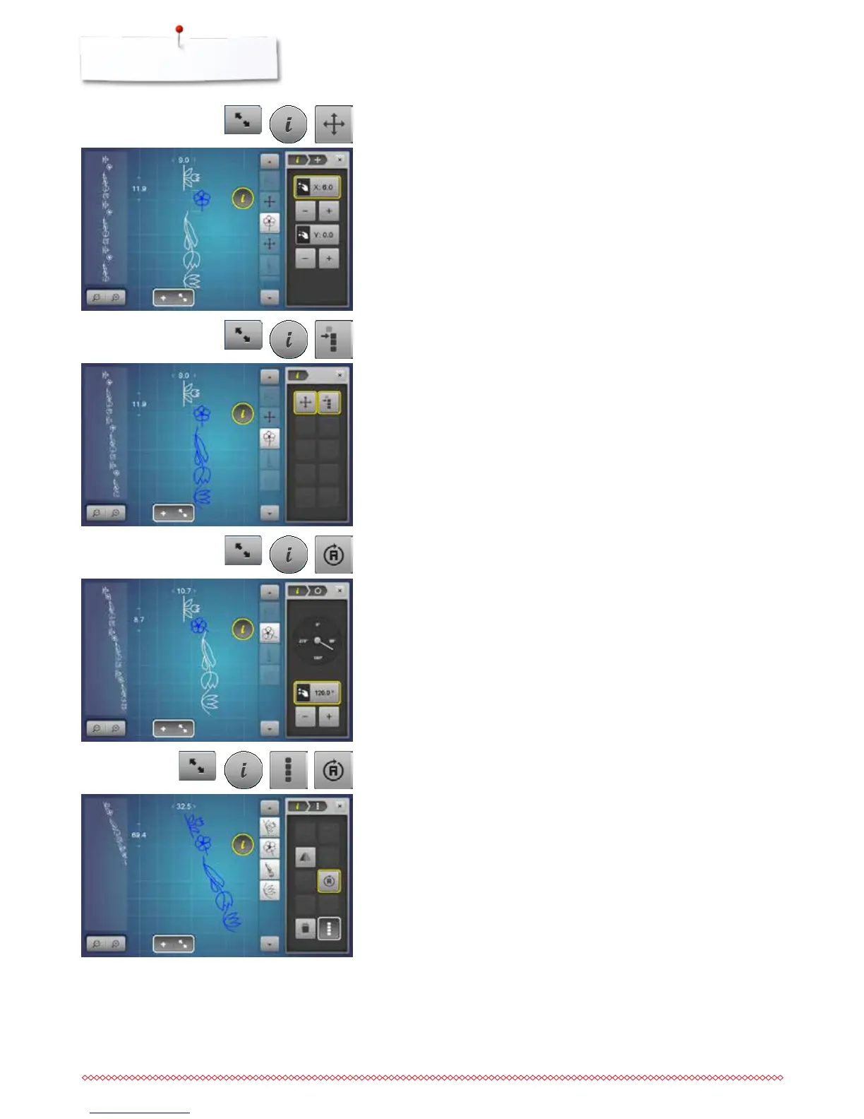 move the stitch pattern in 0.1 mm steps using the knobs or «+»/«-»-icons or