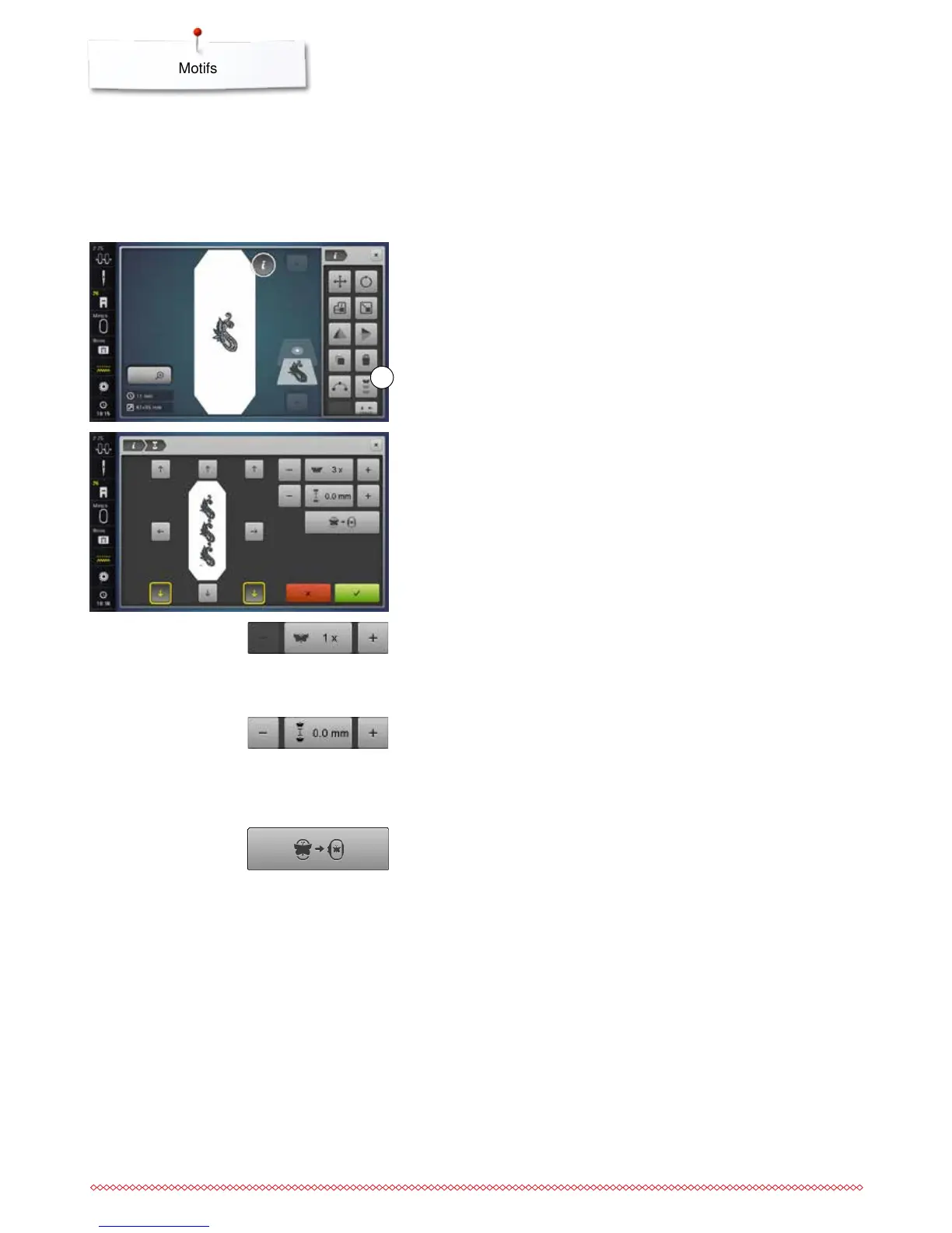 via the stitch width knob or the «+» or «-»-icons the number of motifs can