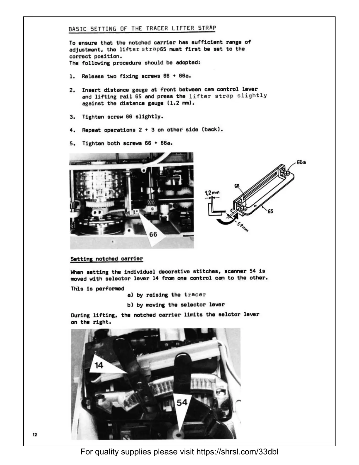 Bernina 932 - Tracer, Cam, and Stitch Selection Adjustments; Tracer Lifter Strap Setting; Notched Carrier Setting for Decorative Stitches